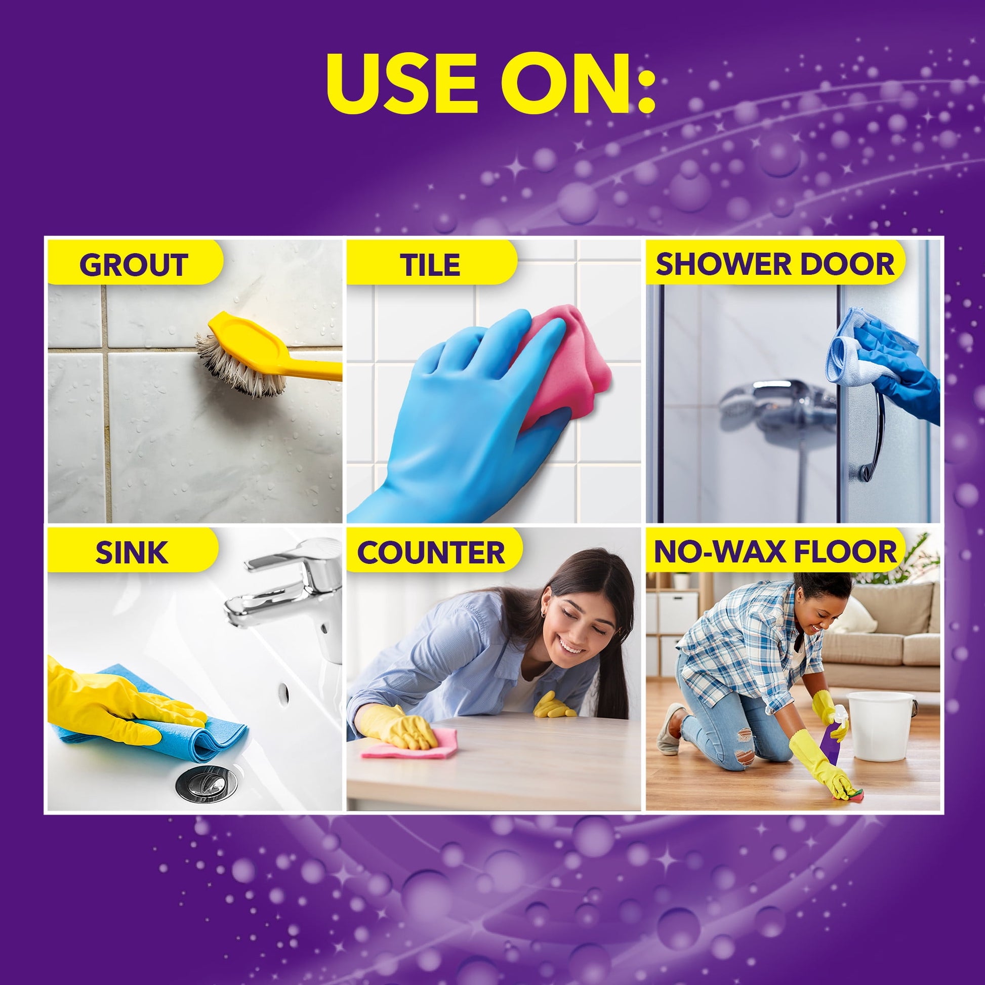 CLEANS SOAP SCUM, MOLD, AND MILDEW STAINS from bathroom and household surfaces like grout, tile, tubs, shower doors, vinyl shower curtains, sinks, counters, and even no-wax floors. Just spray and wipe this bathroom cleaner for sparkling results.