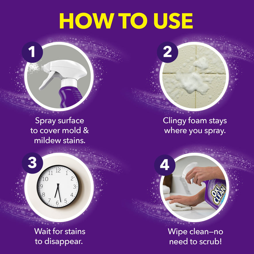 OxiClean + Bleach Mold & Mildew Bathroom Stain Remover obliterates grime, dirt, and soap scum from your tub and shower. Our no-drip formula sprays as a foaming cleaner that clings to vertical surfaces, crevices, and corners. Our powerful 100% Tough bleach-powered foam stays where you spray for easy stain removal without needing to scrub hard! The bleach-based formula penetrates tough mold and mildew stains— just wipe for a fresh clean! Dirt, grime, and stains easily wipe away from bathroom and household surfaces like: grout, tile, tubs, glass shower doors, vinyl shower curtains, ceramic sinks, counters, and even no-wax floors. All that’s left is a sparkling shine and the satisfying clean you can only get from OxiClean.