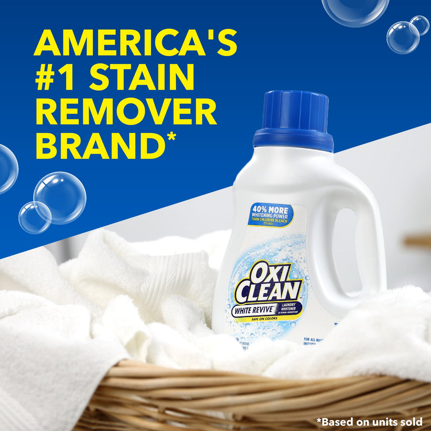 Revive dingy whites and remove tough stains with OxiClean White Revive Laundry Whitener and Stain Remover Liquid. This laundry detergent booster whitens whites 40 percent better than chlorine bleach per load without the risk of chlorine spills and splatters. When used as directed, this oxygen-based, water-activated, color-safe stain remover for white clothes removes stains, and brightens and revives machine-washable white clothes, canvas shoes, sheets, t-shirts and more, all without the harsh smell of chlorine bleach. For best results, presoak clothes in a mixture of this fabric whitener and water following label directions. You can also pretreat stains by applying this stain remover liquid directly to the stain, then washing as usual. Ideal for HE and standard washing machines, just pour this laundry detergent booster along with your regular laundry detergent, following label directions, as a chlorine bleach alternative whitener for clothes. The 66 fl oz bottle has enough laundry booster for many loads, so you can wear white fearlessly. From stain removers and laundry boosters to household cleaners and much more, OxiClean offers a product to fit your needs.