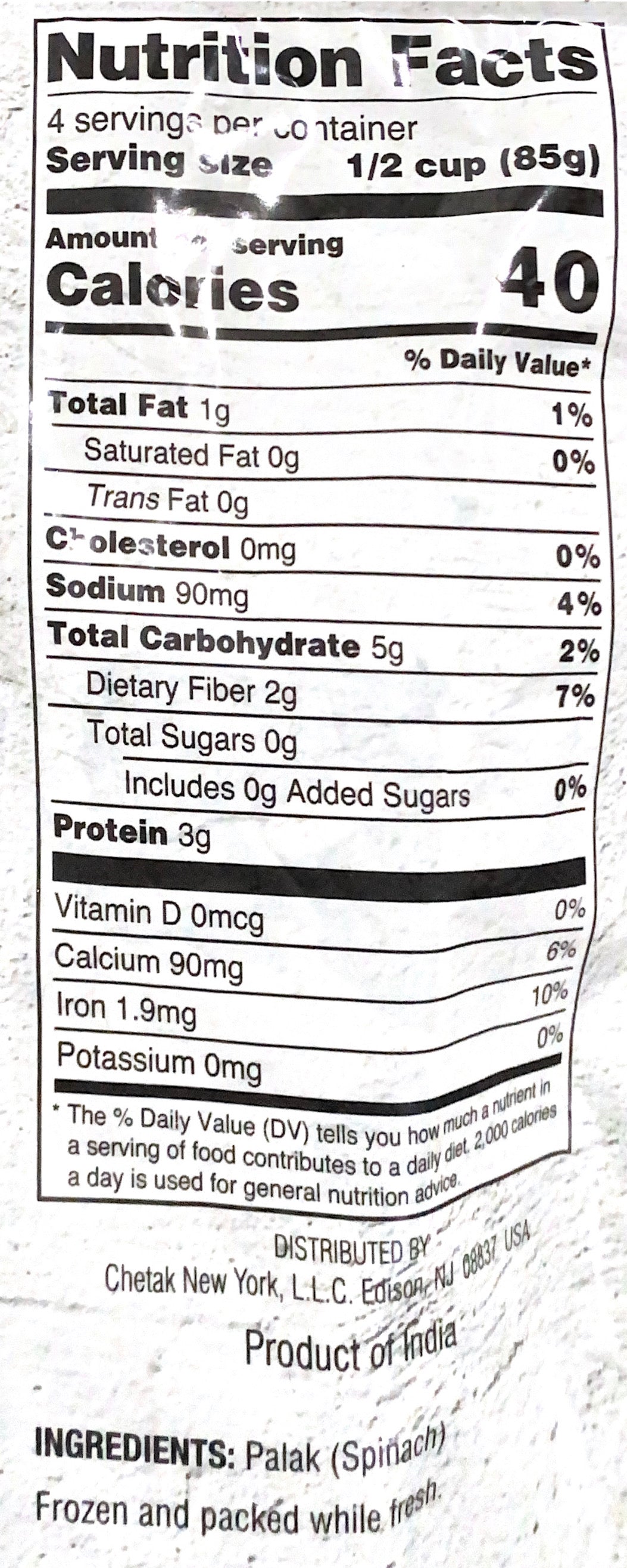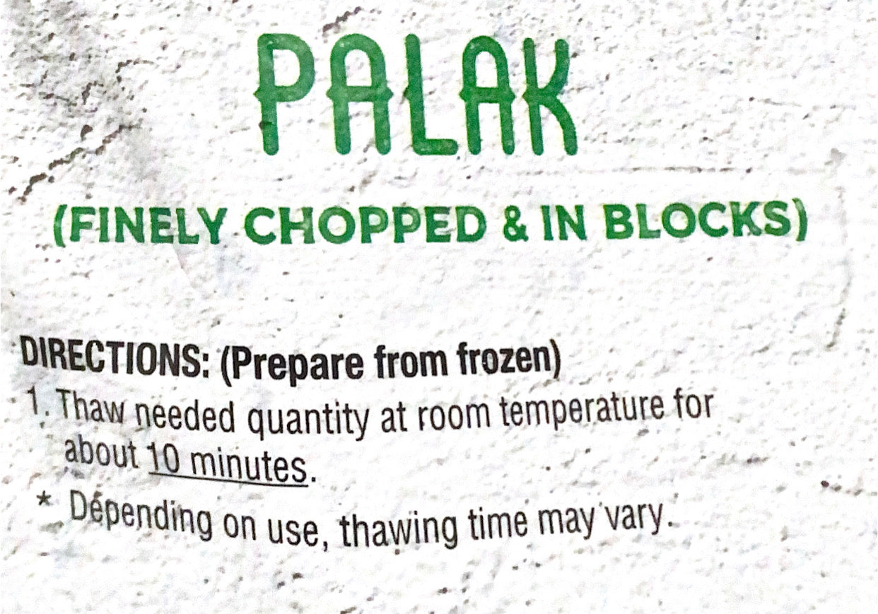 Palak or Spinach is a green leafy vegetable found in India. Like all leafy vegetables, Palak or Spinach leaves have a high nutritional value. Spinach is picked by hand at peak maturity and frozen on harvest day to lock in all nutrients and flavor.