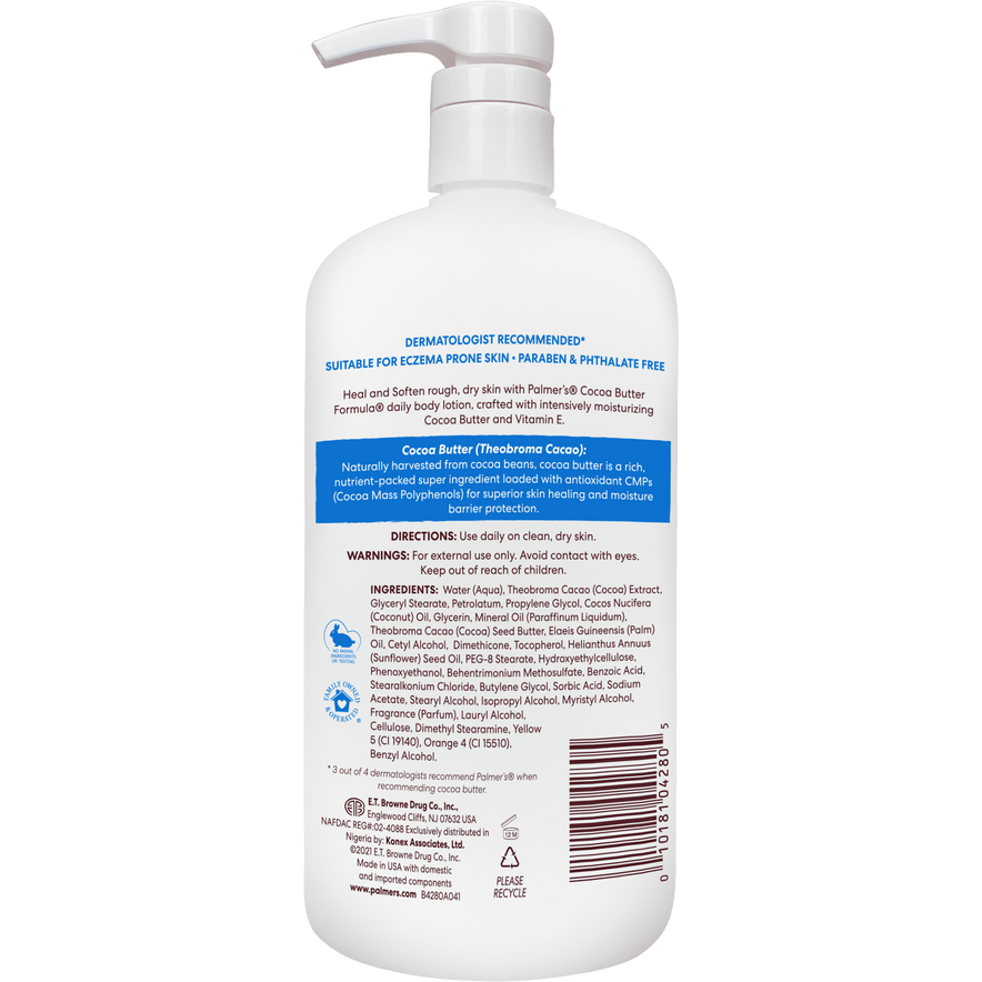 Enjoy time-honored relief for dry, cracked skin with rich, luxurious Palmer's Cocoa Butter Formula Daily Skin Therapy hand and body lotion, which provides deep hydration all over. This velvety soft formula is formulated to absorb quickly and create a protective barrier that locks in moisture. From normal skin to dry skin to eczema prone skin, this emollient rich moisturizing cocoa butter lotion for extra dry skin effectively heals and softens, leaving skin smooth, supple and beautiful.