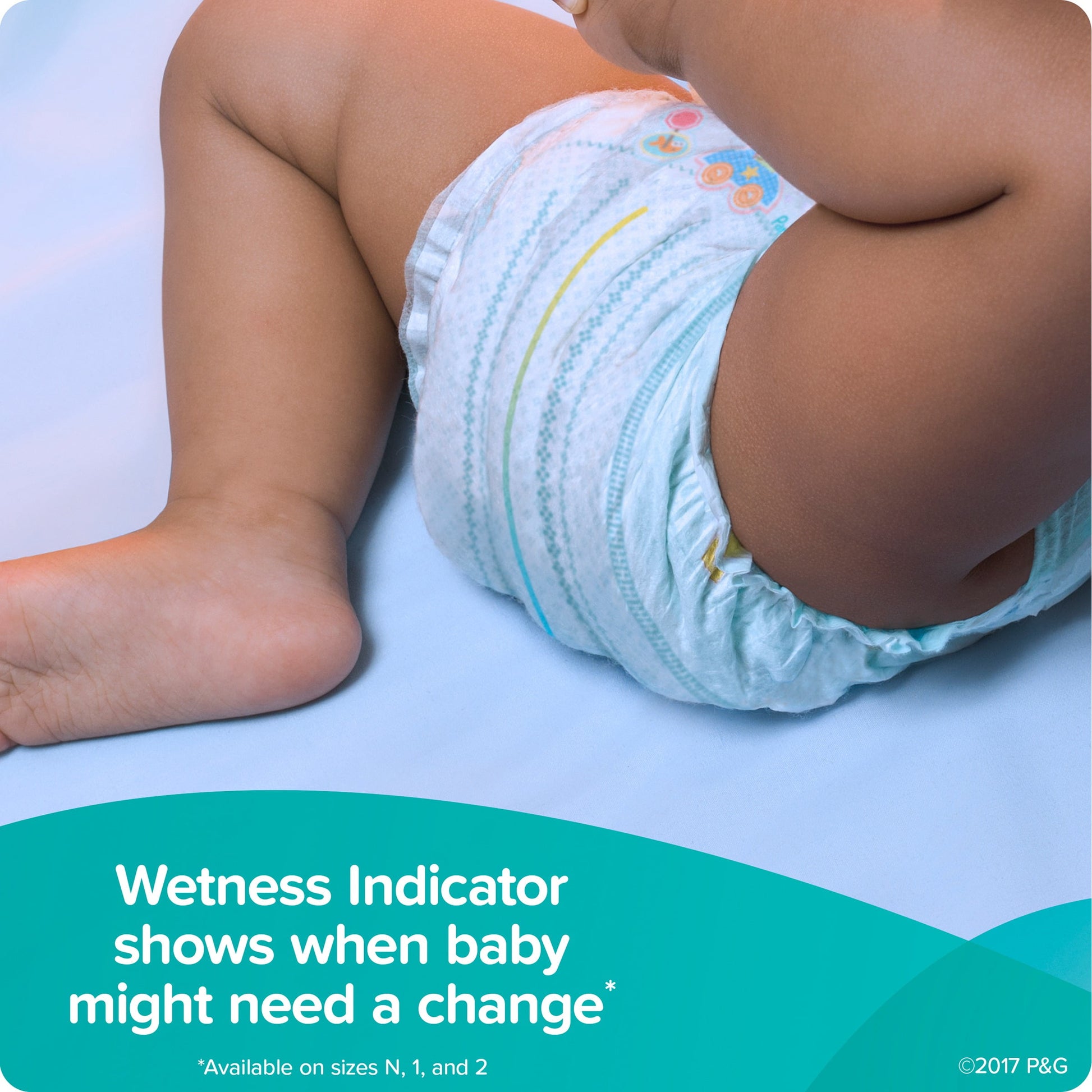 Your baby can get up to 12 hours of overnight dryness with Pampers Baby-Dry diapers. They have 3 Extra Absorb Channels that help distribute wetness evenly and lock it away better.** Sizes N, 1, and 2 have a color-changing Wetness Indicator to help you know when it might be time for a change. Pampers Baby-Dry diapers are available in sizes N, 1, 2, 3, 4, 5, and 6.