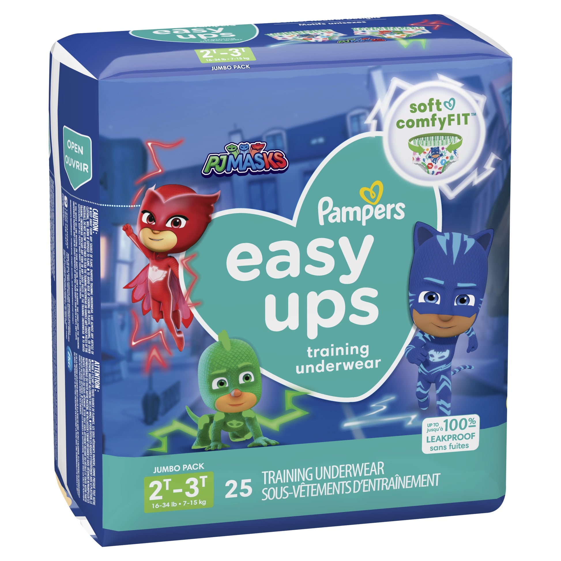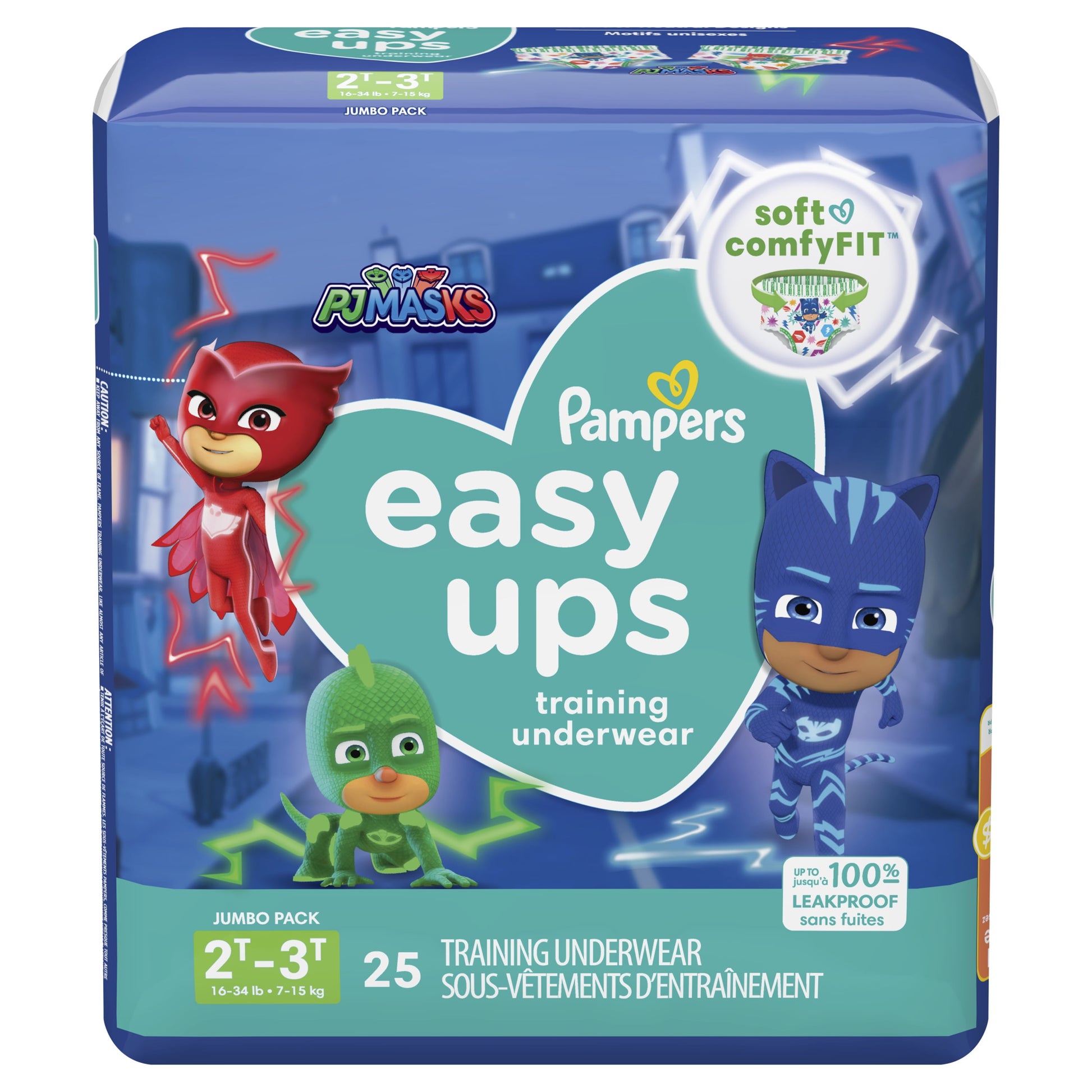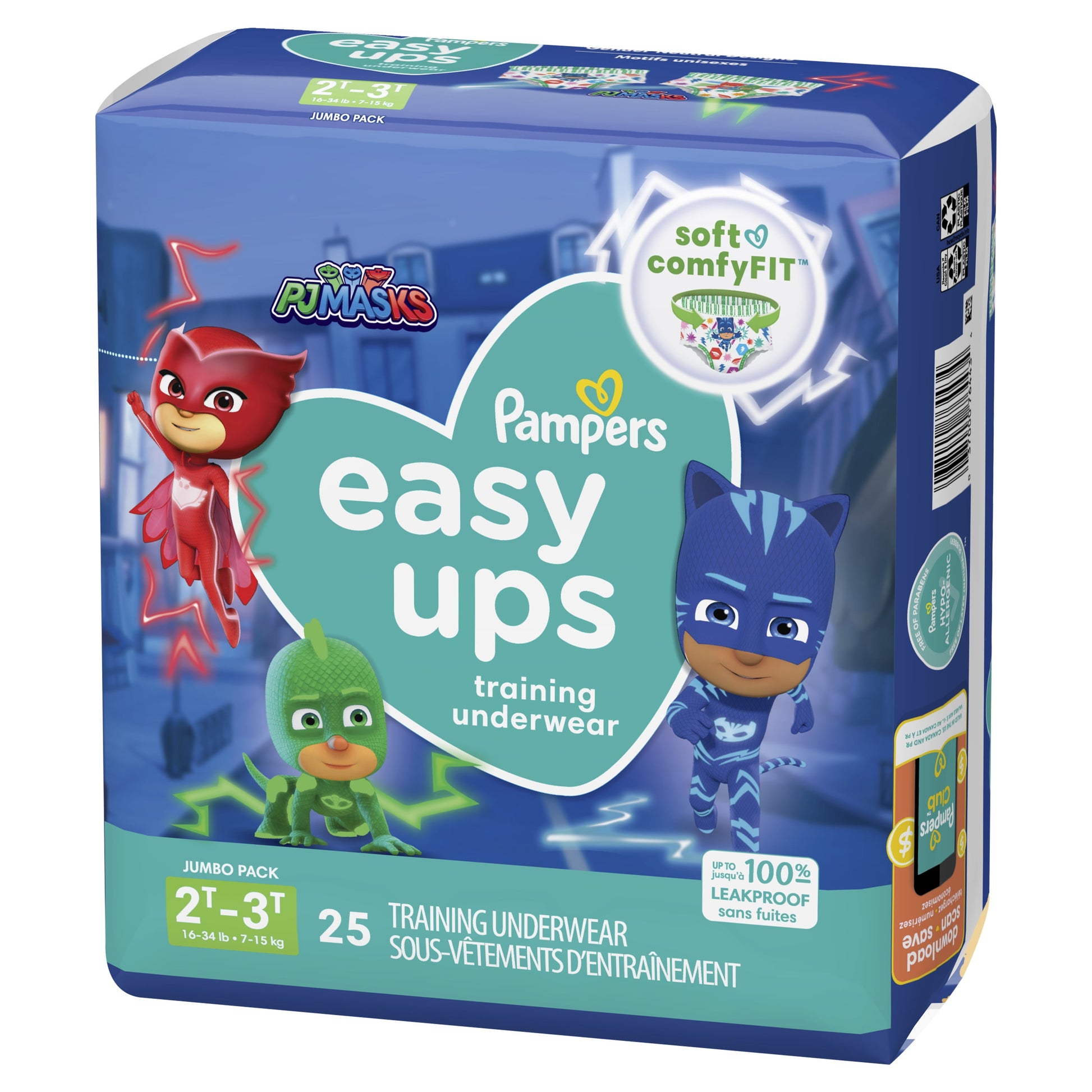 Potty-train like a hero with PJ Masks Pampers Easy Ups Training Pants. Featuring your favorite heroes Catboy, Owlette and Gekko, these super soft and comfy training pants fit just like real cotton undies with a 360 stretchy waistband that is gentle on your child's skin and easy to pull up and down. Plus, they're dermatologically tested, hypoallergenic, and free of parabens and latex.* That's just one of the many reasons Pampers is the #1 pediatrician recommended brand.When it comes to potty accidents, your toddler will be covered with up to 100% leakproof protection. To protect where leaks happen most, Easy Ups are made with Dual Leak-Guard Barriers around the leg cuffs while Extra Absorb Channels quickly absorb accidents and lock them away from your toddler's skin. And when it's time to take them off, Easy-Tear Sides make removal and disposal a cinch.Potty-training is a journey and can take your toddler 90 days on average to catch on. So, Pampers Easy Ups makes it easy with each box containing a one-month supply of training pants. Available in sizes 2T-3T (16-34 lb), 3T-4T (30-40 lb), 4T-5T (37+ lb) and 5T- 6T (41+ lb).*Natural Rubber
