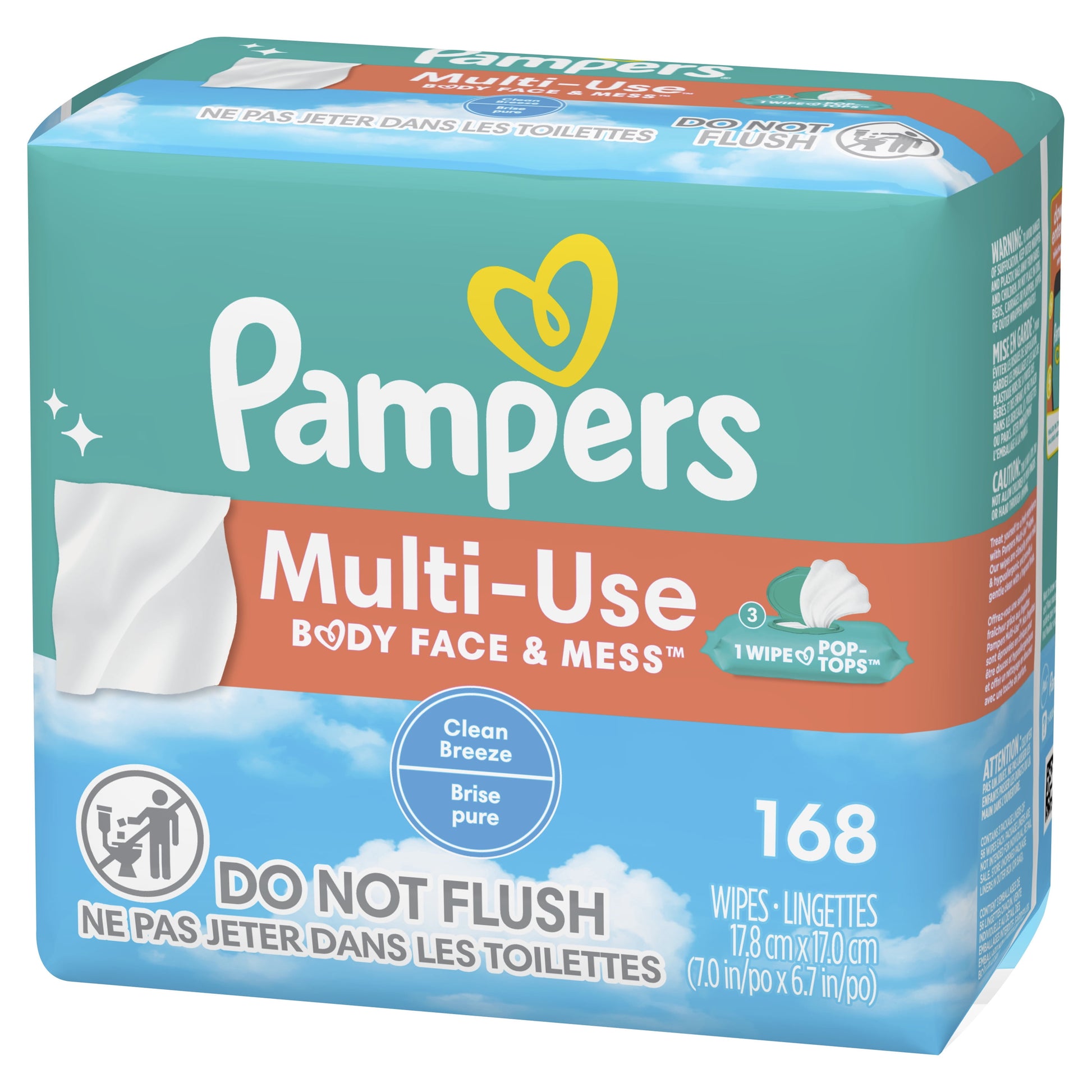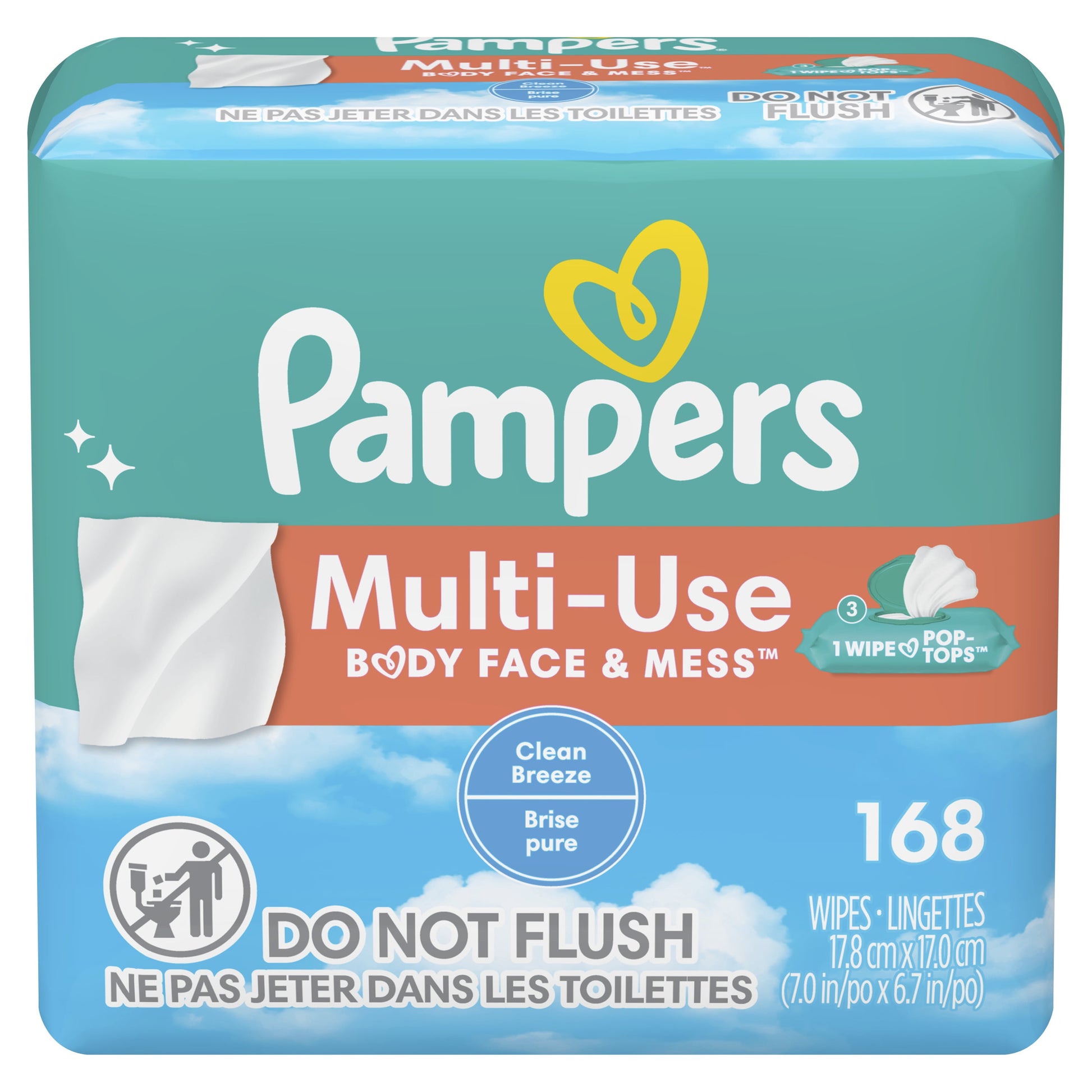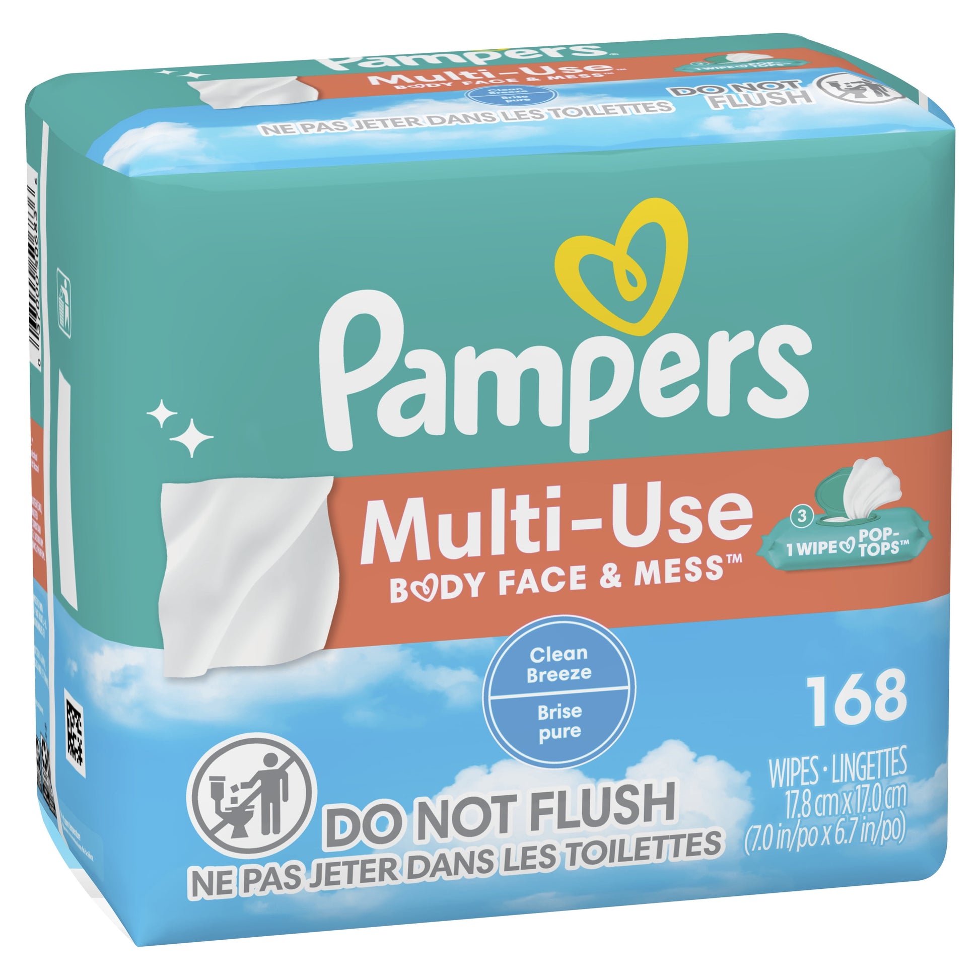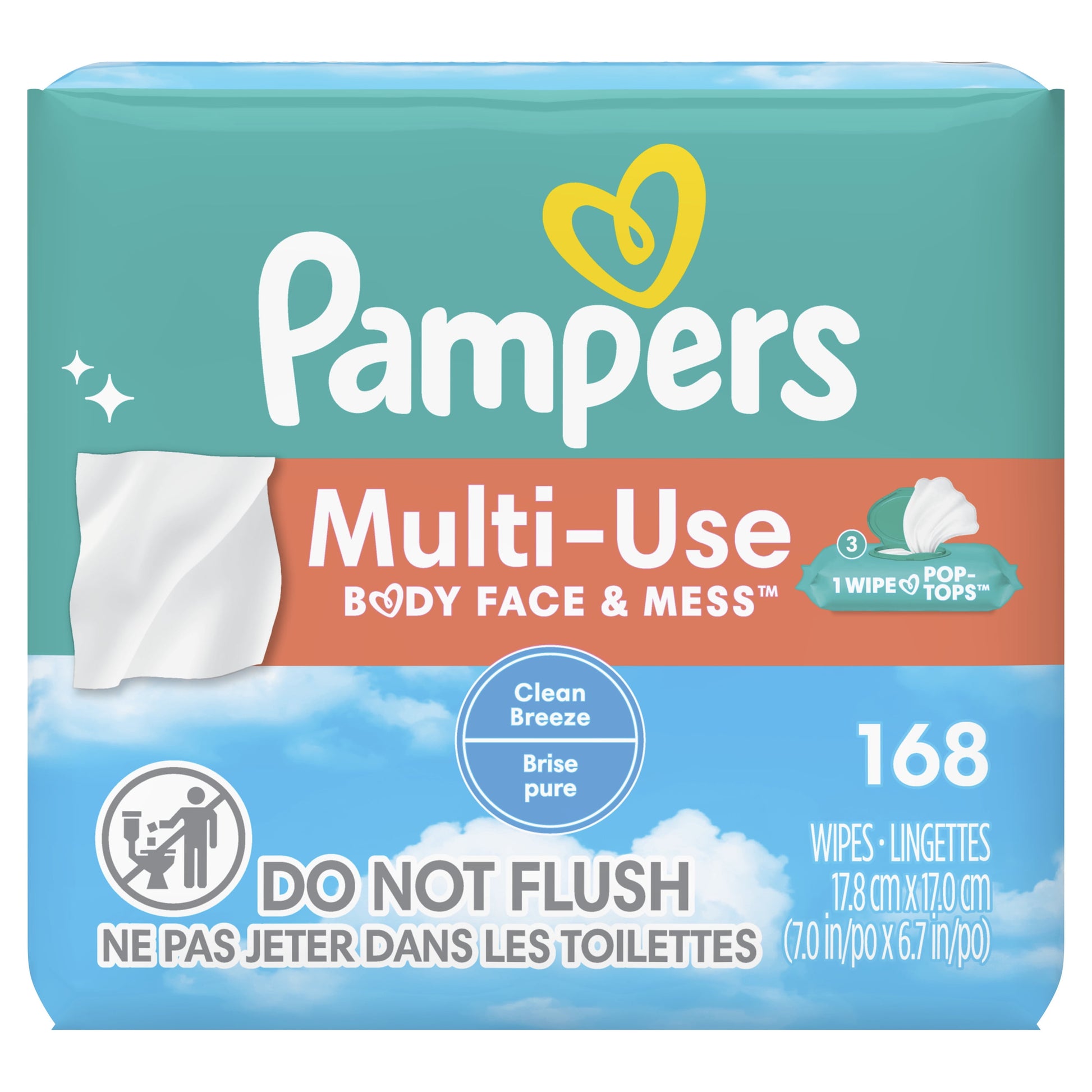 Meet the one wipe for everything. Use Pampers Multi-Use Wipes for messes on body, face, surfaces and more. Multi-Use Wipes are hypoallergenic, and free of any alcohol, parabens, and latex*. They are clinically proven mild and dermatologically tested, too. Our Clean Breeze scent wipes have a delightfully clean and refreshing scent for an enjoyable clean. Our convenient 1-Wipe pop-top is designed to dispense one wipe at a time, so you only get what you need to tackle the mess at-hand. From Pampers, the #1 pediatrician recommended brand. Treat yourself & your little one to a fresh experience with Pampers Multi-Use baby wipes. Wherever your little one leaves a mess, Multi-Use Wipes are a sure bet to clean. *No rubbing alcohol and no natural rubber latex. 168 Wipes