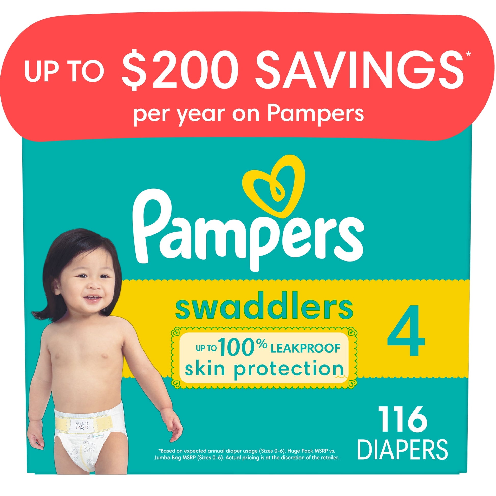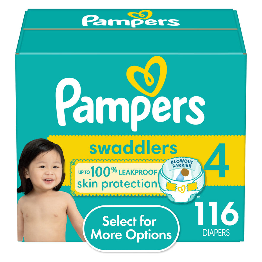 Fear no leaks with new and improved Pampers Swaddlers. Now featuring a Blowout Barrier at the back waist to help prevent up to 100% of leaks, even blowouts. Plus, Dual Leak-Guard Barriers at the legs help protect where leaks happen most. With Swaddlers, you can rest assured that you have superior leak protection* while keeping baby's skin healthy. Pampers Breathe-Free Liner wicks away wetness, allowing baby's skin to breathe, while the Lock-Away Channels help keep baby's skin dry and healthy. Pampers Swaddlers are dermatologist approved by the Skin Health Alliance, hypoallergenic, and free of parabens and latex. Pampers Swaddlers are available in sizes N-8 and now feature designs with our newest animal characters, Shiloh the Elephant and Freddy the Duck! For trusted protection, trust Pampers, the #1 pediatrician recommended brand.** Product and packaging may vary. Download the Pampers Club App today and earn Pampers Cash!*** Redeem your Pampers Cash for exclusive Pampers coupon savings and rewards. *Based on size 4 vs. the "Everyday-of-the-year" brand **Based on a 2021 survey of U.S. and Canadian pediatricians. ***Only redeemable via Pampers Club. No cash value. 0% PARABENS AND LATEX: Latex-natural rubber. 116 Count.