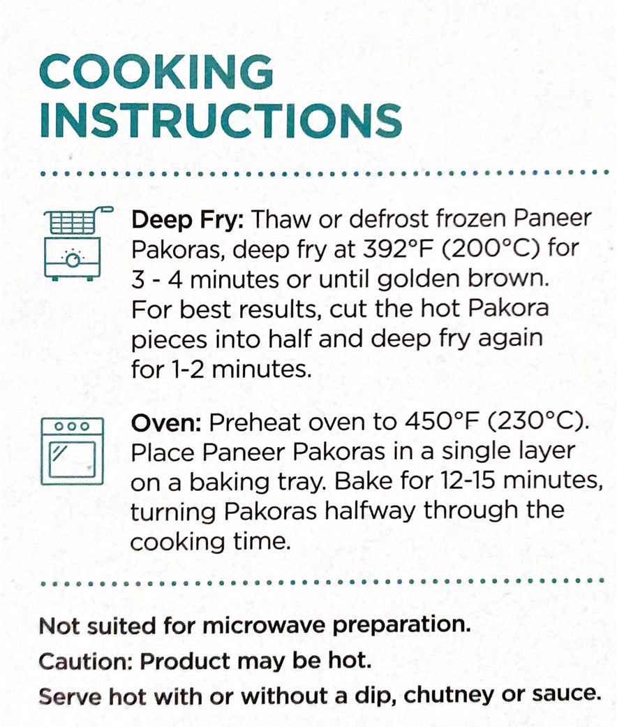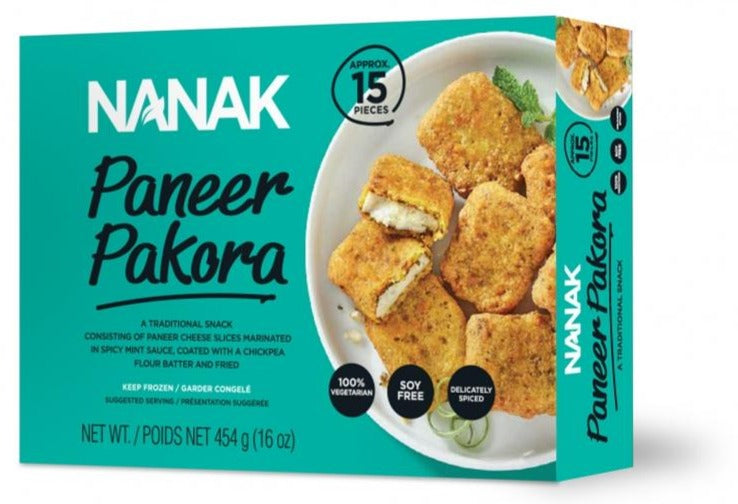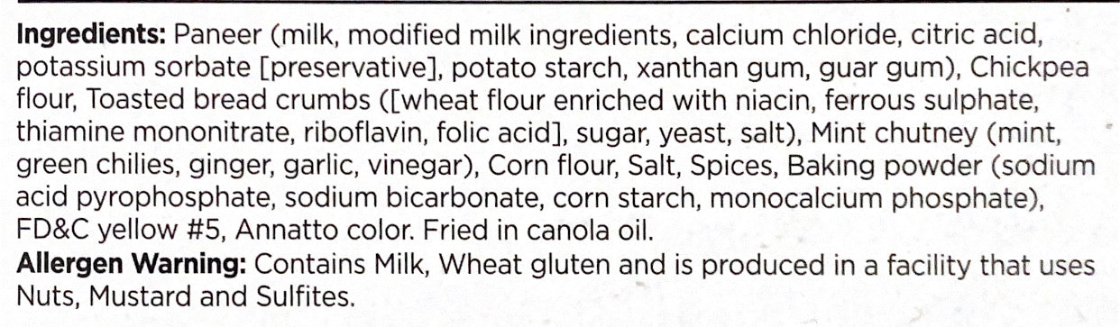 Paneer (milk, modified milk ingredients, citric acid, calcium chloride, potassium sorbate, modified food starch, xanthan gum, guar gum), chick pea flour, toasted wheat crumbs, mint chutney (mint, green chilies, ginger, garlic, vinegar), corn flour, salt, spices, baking powder, color, fried in canola oil.