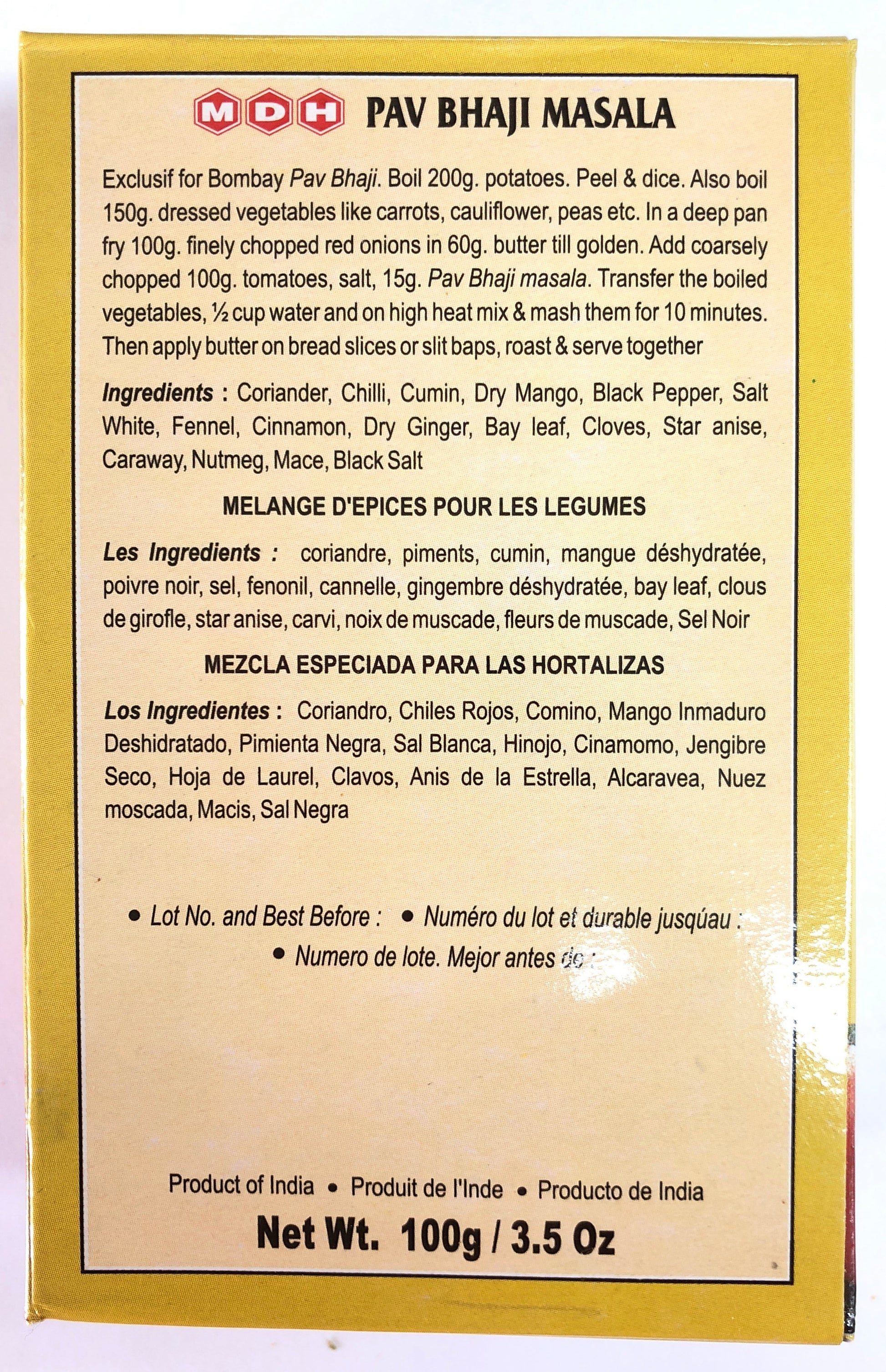 Recipe : Exclusif for Bombay Pav Bhaji. Boil 200g. potatoes. Peel & dice. Also boil 150g. dressed vegetables like carrots, cauliflower, peas etc. In a deep pan fry 100g. finely chopped red onions in 60g. butter till golden. Add coarsely chopped 100g. tomatoes, salt, 15g. Pav Bhaji masala. Transfer the boiled vegetables, ½ cup water and on high heat mix & mash them for 10 minutes. Then apply butter on bread slices or slit baps, roast & serve together.