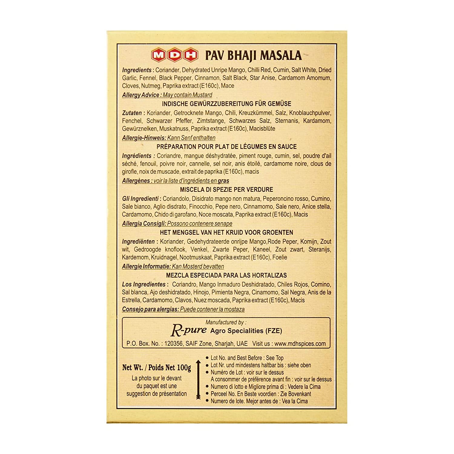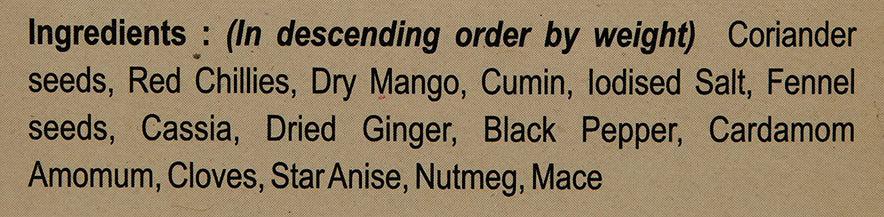 Ingredients : Coriander seeds, Red Chillies, Dry Mango, Cumin, Iodised Salt, Fennel Seeds, Cassia, Dried Ginger, Black Pepper, Cardamom Amomum, Cloves, Star Anise, Nutmeg, Mace.