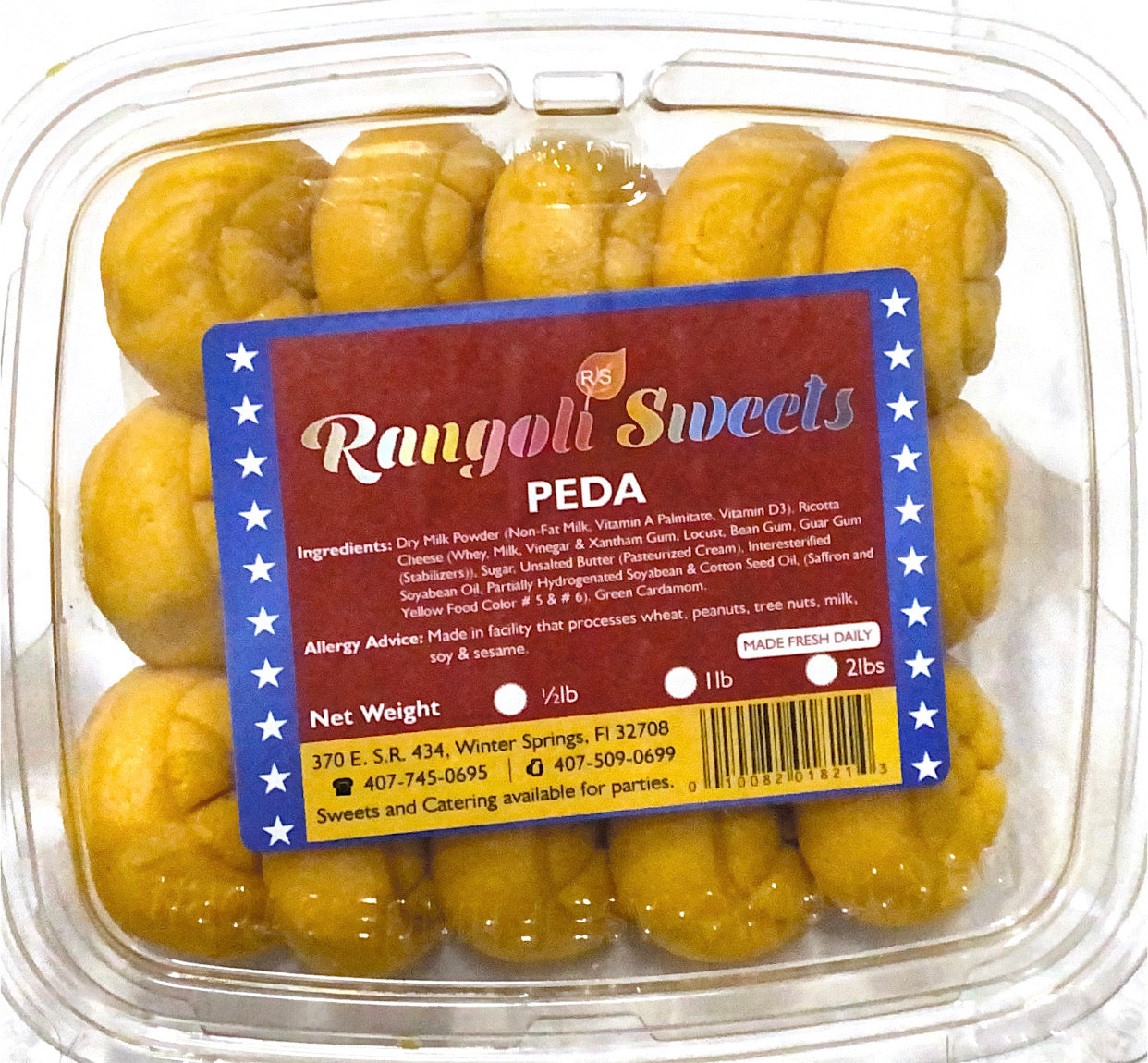 Peda or Pera is a sweet dish hailing from the Indian subcontinent. It originated from Mathura, Uttar Pradesh, India. Usually prepared in thick, semi-soft pieces, its main ingredients are khoa, sugar and traditional flavorings including cardamom seeds, pistachio nuts and saffron.