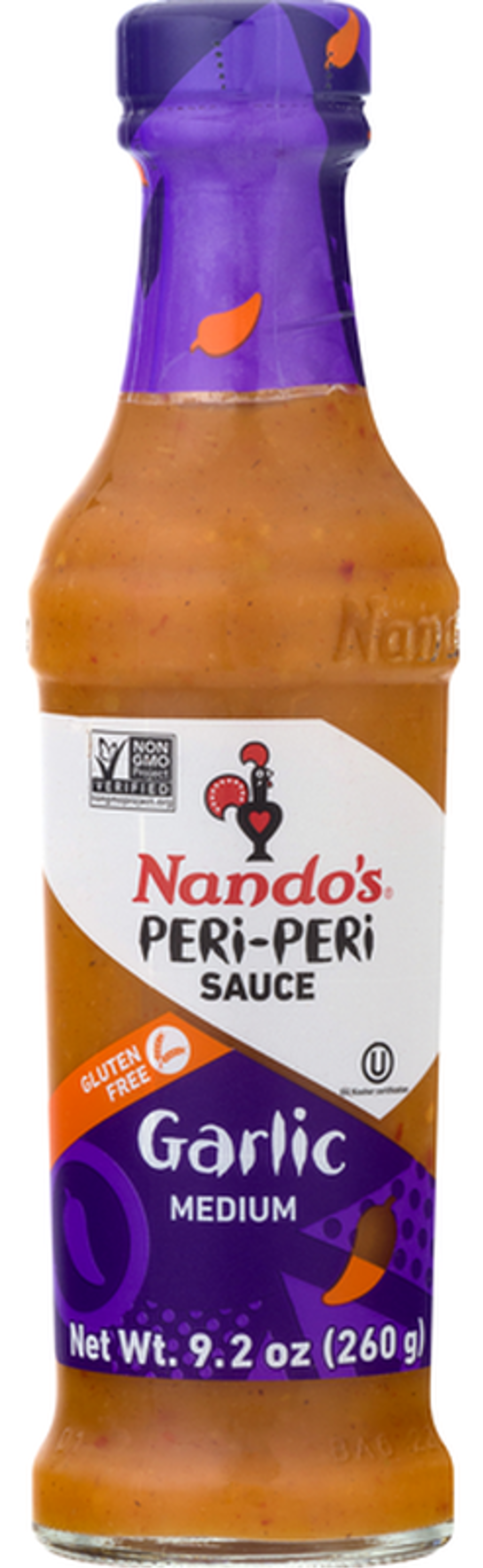 No artificial colors. No artificial flavors. Gluten free. Vegetarian. Non GMO Project verified. nongmoproject.org. Peri-Peri Ometer: Medium. Our Peri-Peri sauce is made with African bird's eye chilli and a blend of ingredients - onion, sun-ripened lemons, garlic and spices. This one has an extra wave of garlic flavor. Peri-Peri is the heart & soul of Nando's and the secret ingredient behind our restaurants worldwide. Condiment. Ingredient. Marinade. Shared with love. No looking back. Vegetarian. Born in South Africa. Made in the Netherlands.