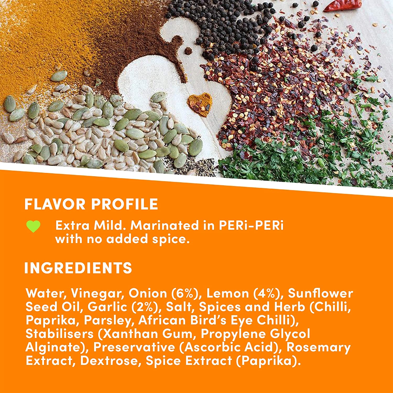 Water, Vinegar, Onion Puree (6%), Lemon Puree (4%), Sunflower Seed Oil, Garlic Puree (2%), Salt, Spices and Herb (Chilli, Paprika, African Bird’s Eye Chilli), Stabilisers (Xanthan Gum, Propylene Glycol Alginate (Derived from Seaweed)), Preservative (Ascorbic Acid), Rosemary Extract, Dextrose, Spice Extract (Paprika).