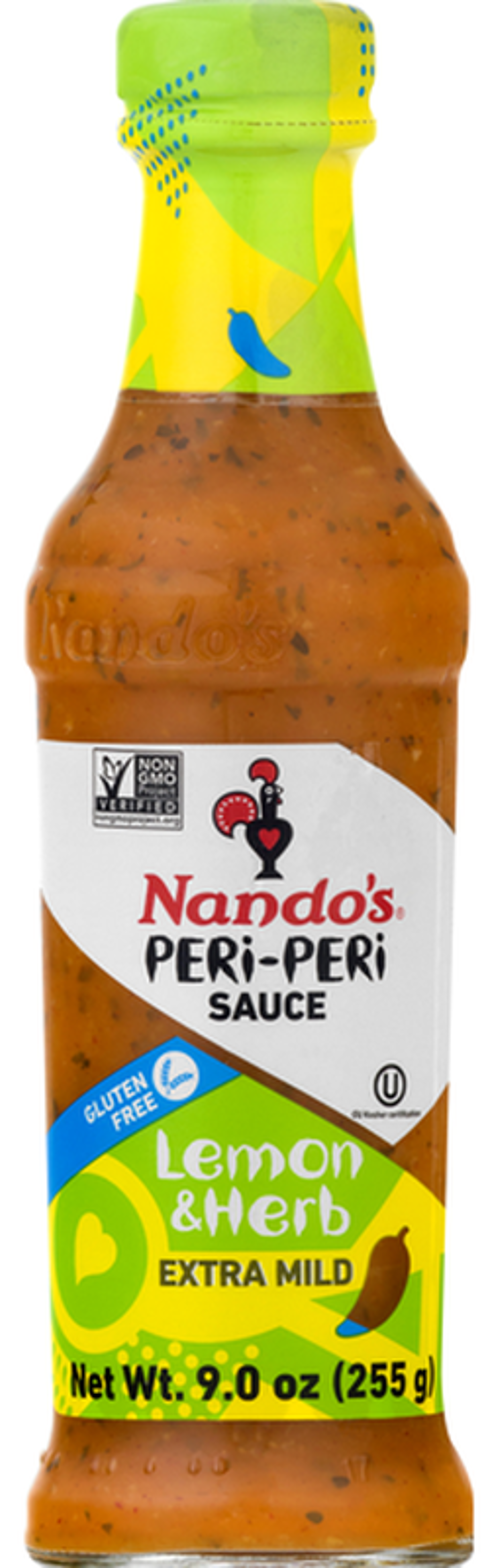 No artificial flavors. Gluten free. Vegetarian. Non GMO Project verified. nongmoproject.org. Peri-Peri Ometer: Extra mild. No artificial colors. No looking back. Our Peri-Peri sauce is made with African bird's eye chilli and a blend of ingredients - onion, sun-ripened lemons, garlic and spices. This one is extra zesty, with a touch of parsley. Peri-Peri is the heart & soul of Nando's and the secret ingredient behind our restaurants worldwide. Condiment. Ingredient. Marinade. Shared with love. nandosperiperi.com/sauces. Recipes and Ideas: nandosperiperi.com/sauces. Born in South Africa. Made in the Netherlands.