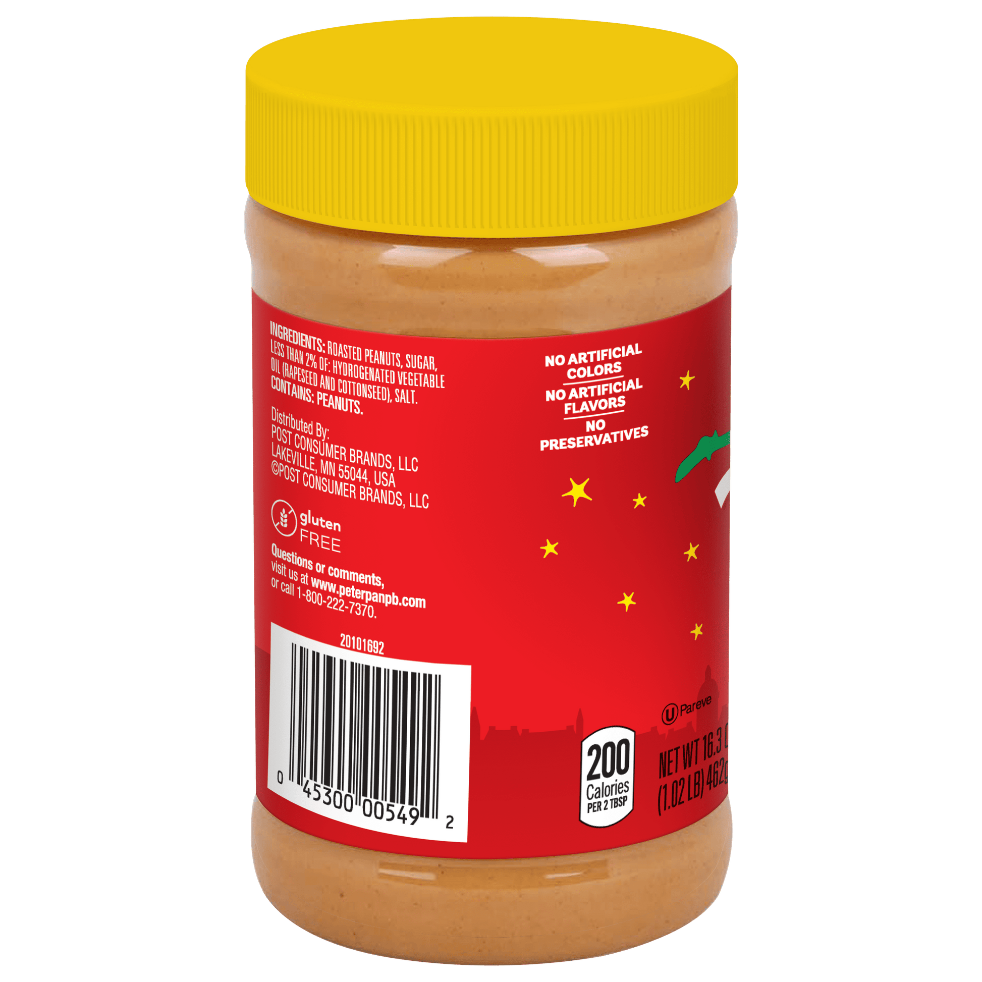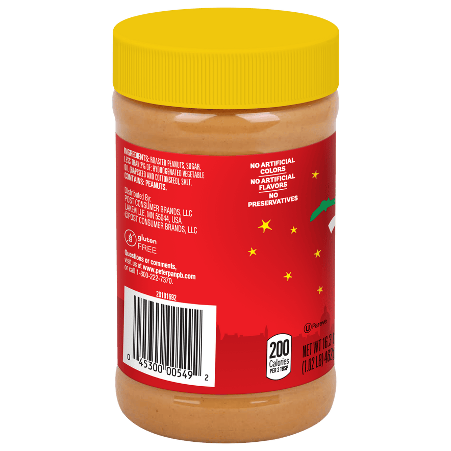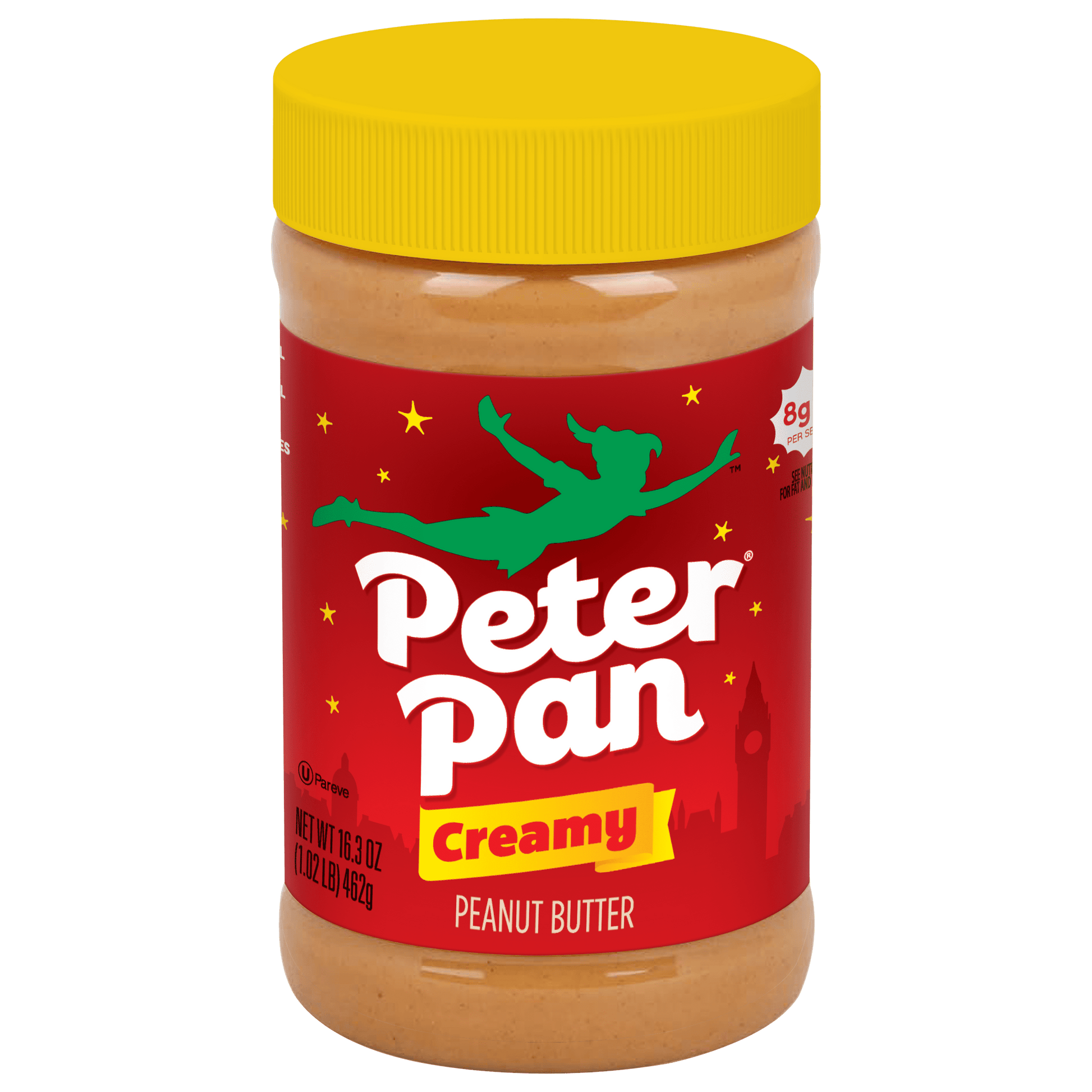Peter Pan Creamy Peanut Butter is a classic smooth spread made with roasted peanuts for a delicious peanut butter flavor. Creamy and smooth, Peter Pan Peanut Butter spreads easily on all of your favorite breads and snacks. This peanut butter spread is perfect for topping your morning toast or adding to your lunchtime peanut butter and jelly sandwich. Use it as a dip with apples or crackers for an easy peanut butter snack, or whip up a batch of delicious peanut butter cookies for dessert. This gluten free peanut butter contains no artificial colors, artificial flavors or preservatives, and it has 8 grams of protein per serving. Each 16.3 ounce jar of peanut butter comes with a screw top lid for easy use and storage. With every spoonful, Peter Pan delivers wholesome energy and a delicious taste that nurtures the simple joys of everyday adventure.