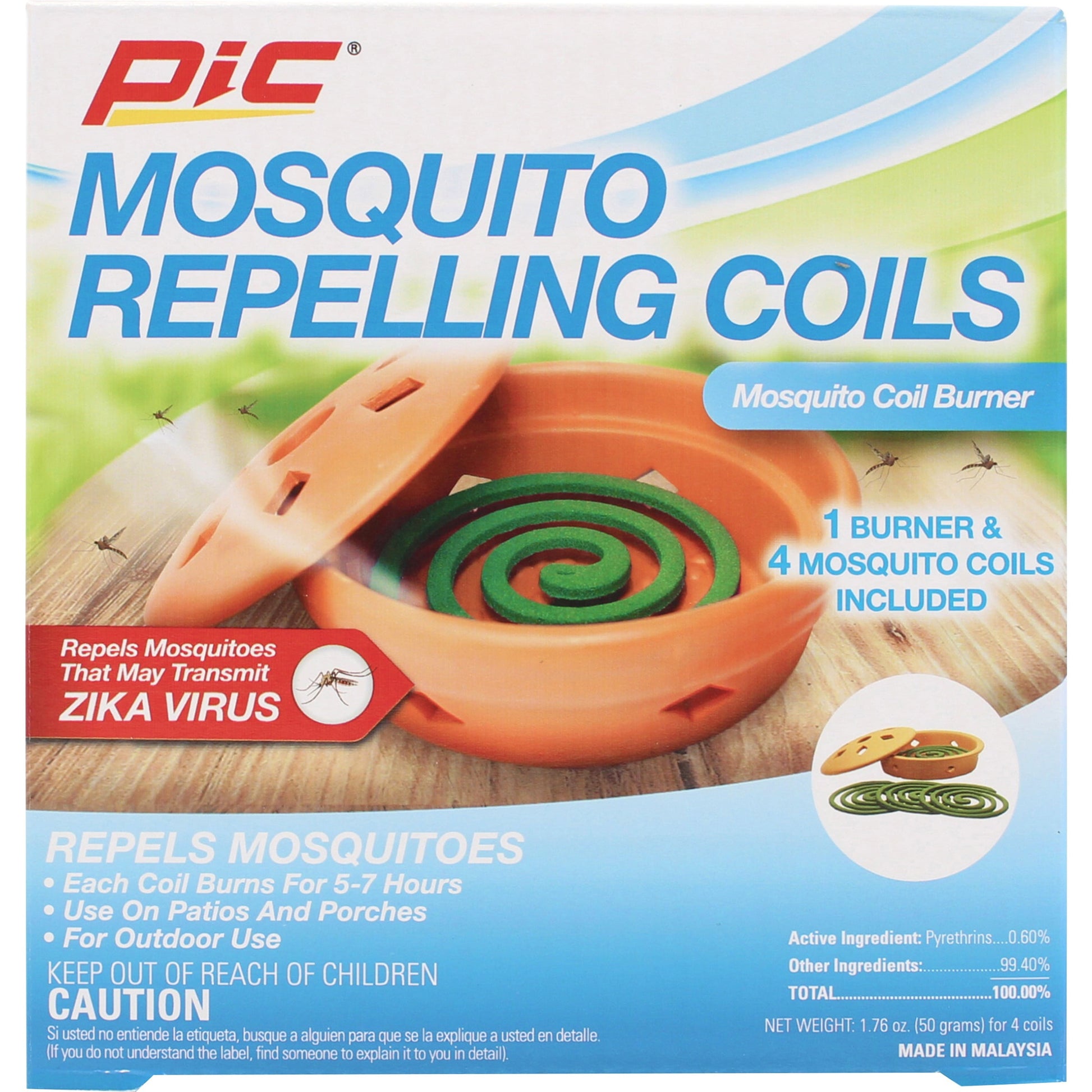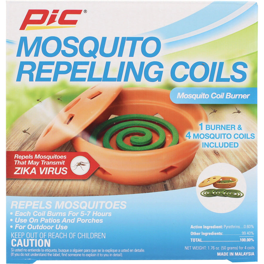 PIC Mosquito Repelling Coils have been a dependable insect control product since 1953 when they were first sold to drive-in theaters. The PIC Mosquito Coil with Terra Cotta Burner Mosquito Repellent contains 4 coils and one terra cotta burner. The burner mosquito repellent helps repel mosquitoes in confined areas outdoors. Each mosquito repellent coil will burn for up to 5-7 hours in total. The terra cotta burner has a built-in metal stand for easy use. These mosquito control coils are perfect for patios and porches - just set them outdoors every 10 ft. for best results. The removable lid can be left on or off the burner to control the amount of air exposed to the burning coil. Do not use indoors and see the packaging for additional instructions for proper use.