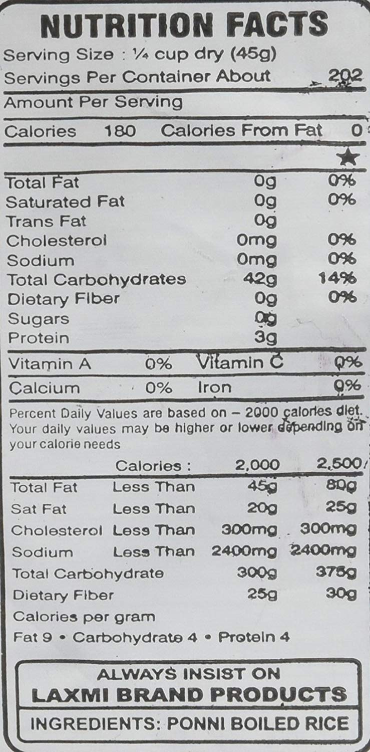 Laxmi Ponni Boiled Rice is a better source of fiber, calcium, potassium and vitamin B-6 and features a rich nutty flavor and silky texture.
