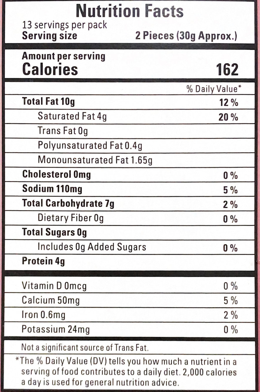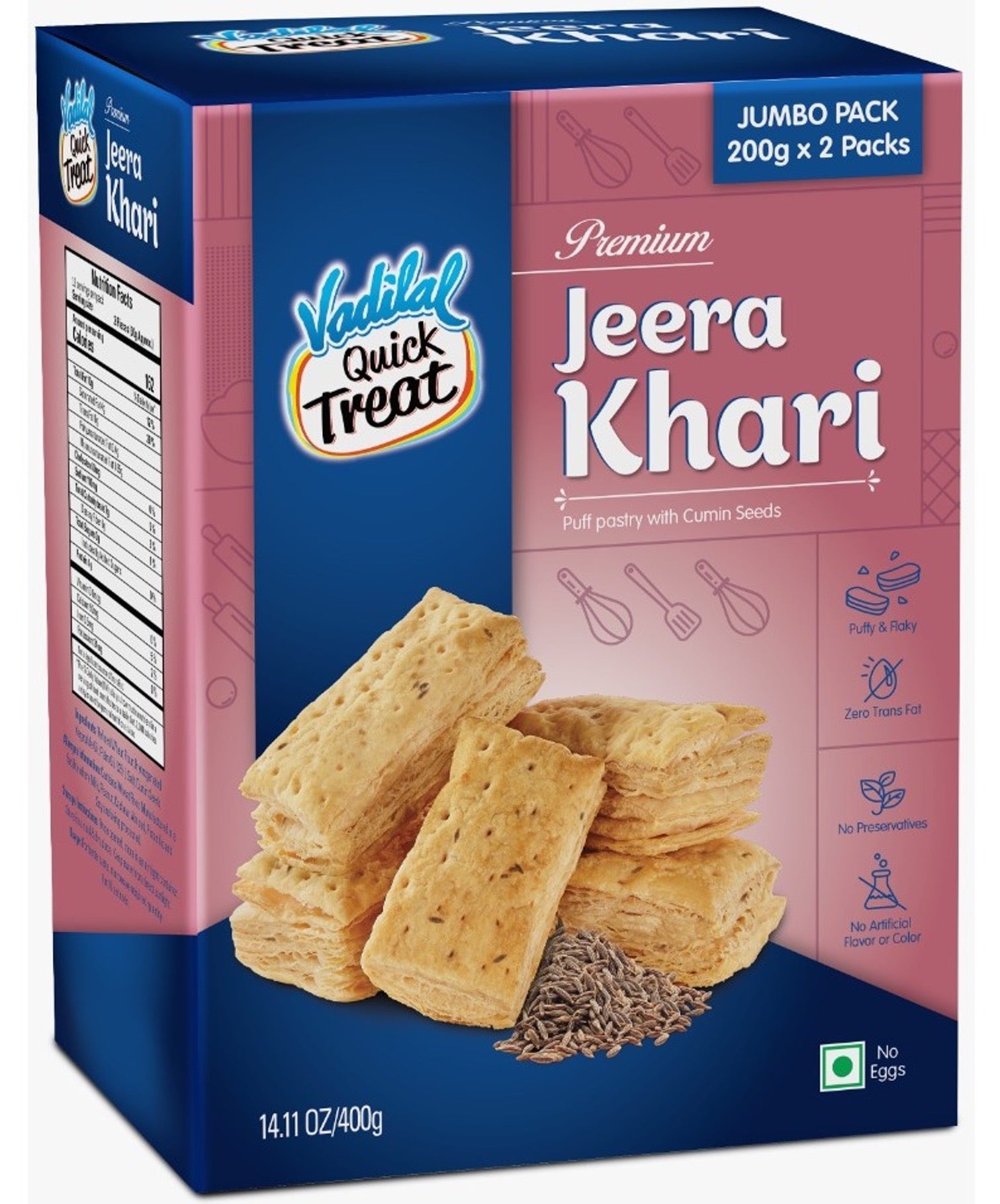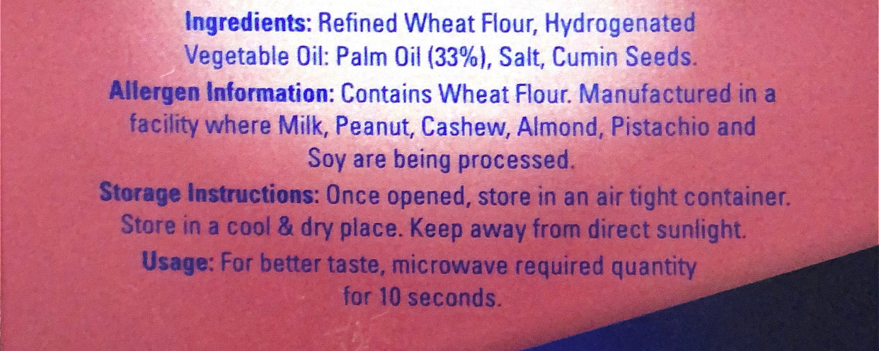 Crispy yet soft, these jeera puff pastries make tea time more enjoyable. Very popular in India, these large laired jeera biscuits are ideal for coffee/tea time. Made from whole wheat flour and spices. This product is the cumin flavour variety.