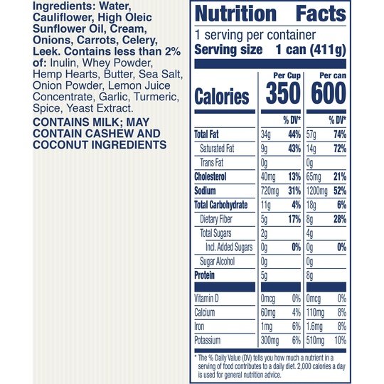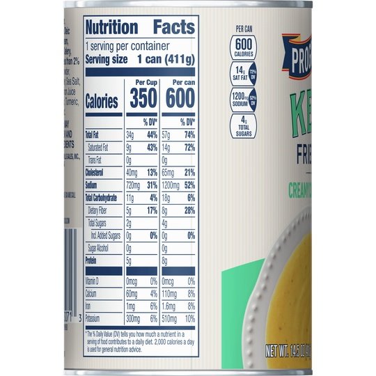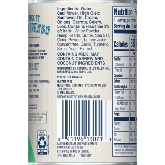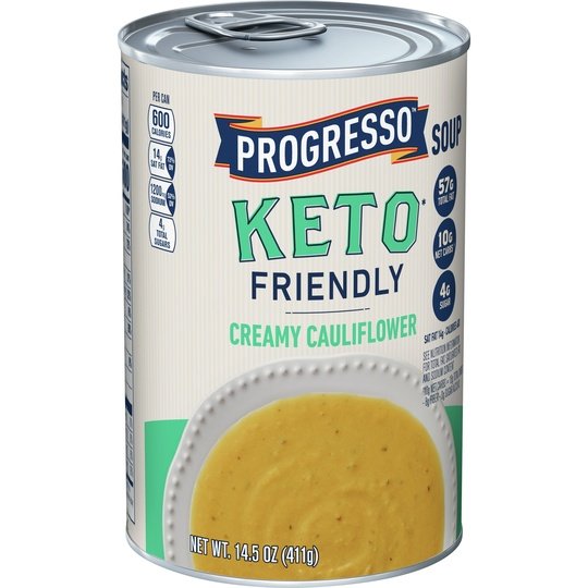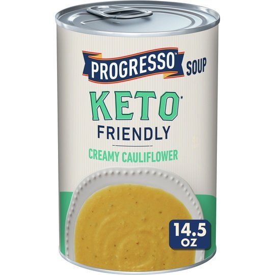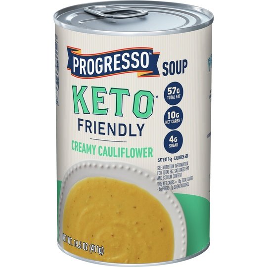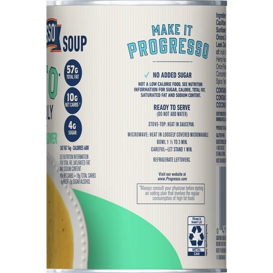With 57 grams of total fat and 10 grams of net carbs† per can, Progresso Keto*-Friendly Creamy Cauliflower canned soup is stocked with delicious ingredients. Don't miss out on the warmth and comfort of soup when you're eating keto*-friendly food. Our cauliflower soup is a tasty addition to a keto*-friendly meal that's high in fat with no added sugars*. Pair with salad or egg salad as part of a quick and easy lunch or dinner. To prepare your instant soup, heat in a microwavable bowl for 1.5 to 3 minutes and then let stand for 1 minute. The best part? You can enjoy the entire can of soup!*Not a low calorie food. See Nutrition Information for Total Fat, Saturated Fat and Sodium Content. Always consult your physician before starting an eating plan that involves the regular consumption of high fat foods.†10g NET CARBS = 18g TOTAL CARBS - 8G FIBER - 0g Sugar AlcoholAt Progresso, we’re passionate about making great products. We've been creating premium soups for more than 100 years. And today, Progresso still uses quality ingredients for a tasteful flavor found only in our line of canned soup products.