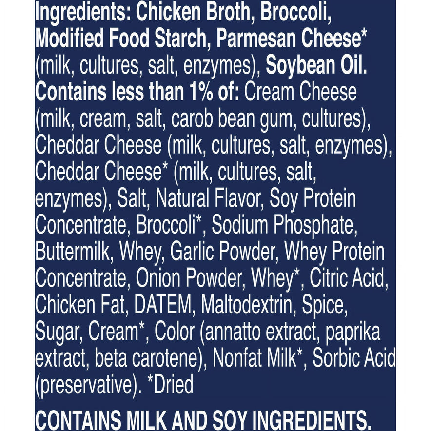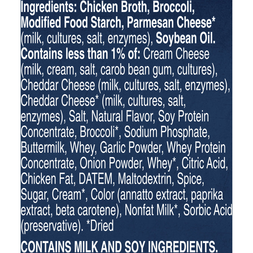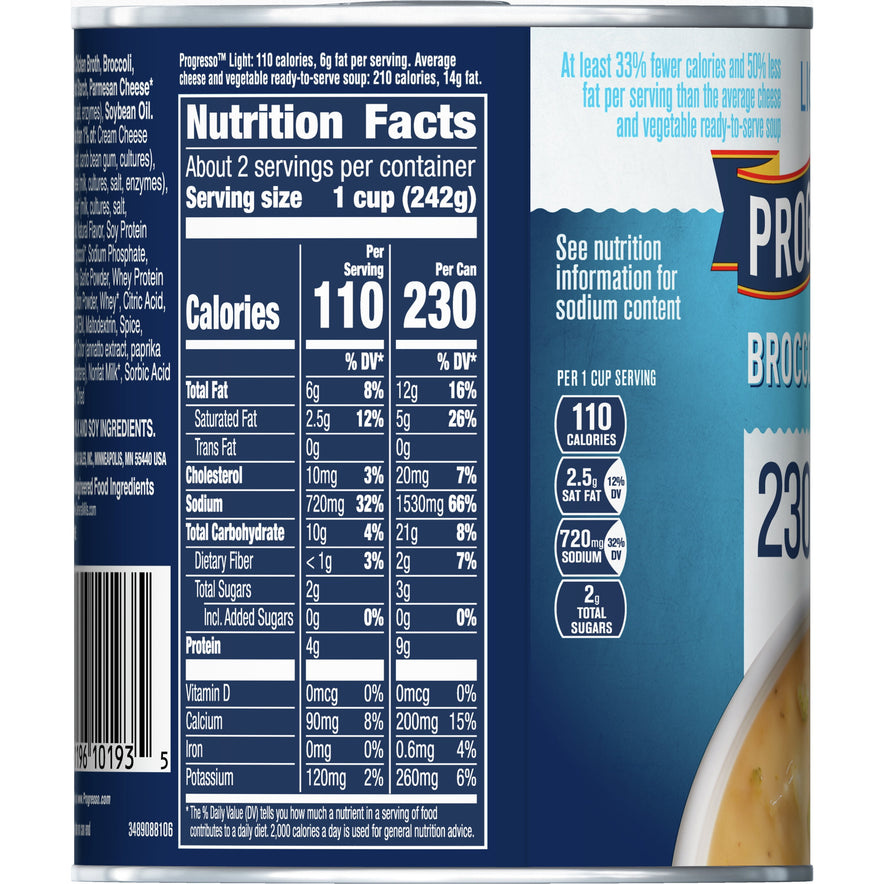 Progresso Light Broccoli Cheese canned soup has at least 33% fewer calories and 50% less fat per serving than the average cheese and vegetable ready-to-serve soup*. This delicious broccoli cheddar soup is creamy, cheesy and divine. Savor every bite of this gluten-free soup made with real cheese, no artificial flavors and no colors from artificial sources. Even better? You can enjoy the entire canned soup at 230 calories. This microwavable soup can be ready to eat in minutes. Serve with a piece of cheesy toast or a warm sandwich as part of comforting, easy meal.*Progresso Light: 110 calories, 6g fat per serving. Average cheese and vegetable ready-to-serve soup: 210 calories, 14g fat.At Progresso, we’re passionate about making great products. We've been creating premium soups for more than 100 years. And today, Progresso still uses quality ingredients for a tasteful flavor found only in our line of canned soup products.