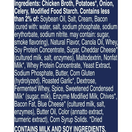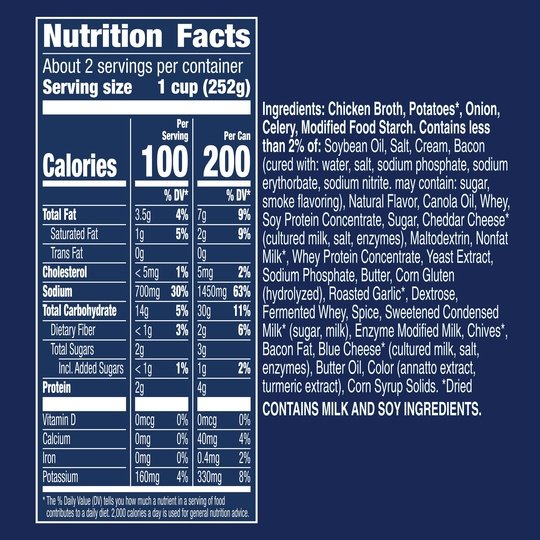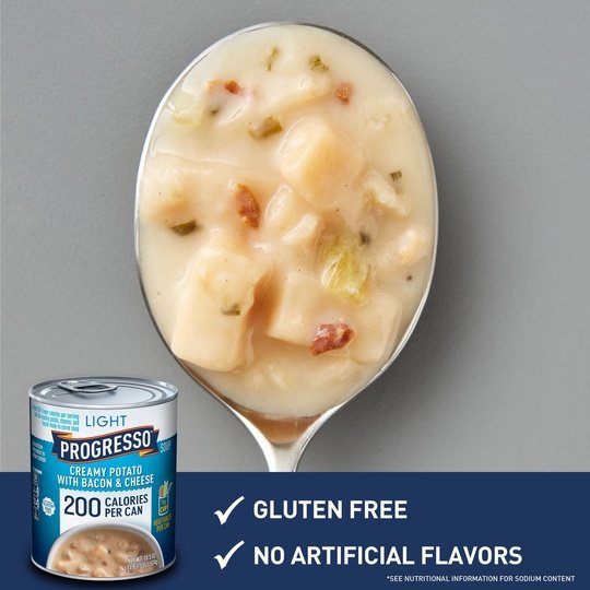 Progresso Light Creamy Potato With Bacon & Cheese canned soup has at least 33% fewer calories per serving than the leading potato, cheese and bacon ready-to-serve soup*. This gluten-free soup is full of delicious potatoes, vegetables, bacon and cheese and provides a half cup of vegetables per can. Even better? You can enjoy the entire can of soup at 200 calories. This microwavable soup can be ready to eat in minutes. Enjoy potato soup with no artificial flavors or colors from artificial sources. Just the taste you expect from Progresso.*Progresso Light: 100 calories, 3.5g fat per serving. Leading potato, cheese, and bacon ready-to-serve soup: 190 calories, 9g fat.At Progresso, we’re passionate about making great products. We've been creating premium soups for more than 100 years. And today, Progresso still uses quality ingredients for a tasteful flavor found only in our line of canned soup products.