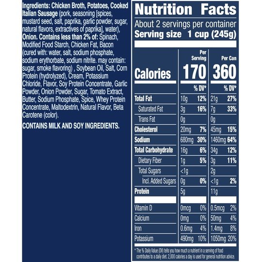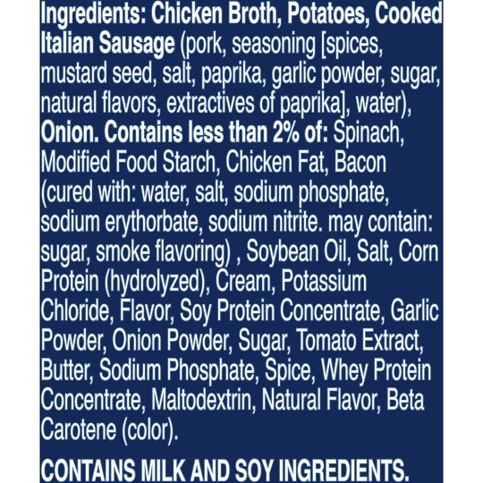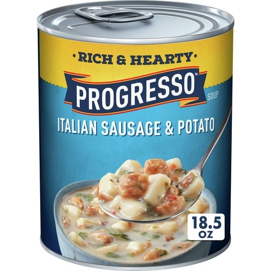 Indulge in the decadence of Progresso Rich & Hearty Italian Sausage & Potato instant soup and add a new flavor variety to your lunch or dinner routine. Savor each bite of Italian sausage with a touch of spice, chopped potatoes, onions and spinach in a delicious chicken broth base. Expand your canned soup selection by trying this tasty, gluten-free flavor. Serve with fresh bread or a warm sandwich as part of a warm and delicious meal. Our Italian sausage and potato soup is quick and easy. Heat in a microwavable bowl on high for 2-4 minutes, let cool for 1 minute, and enjoy.At Progresso, we’re passionate about making great products. We've been creating premium soups for more than 100 years. And today, Progresso still uses quality ingredients for a tasteful flavor found only in our line of canned soup products.