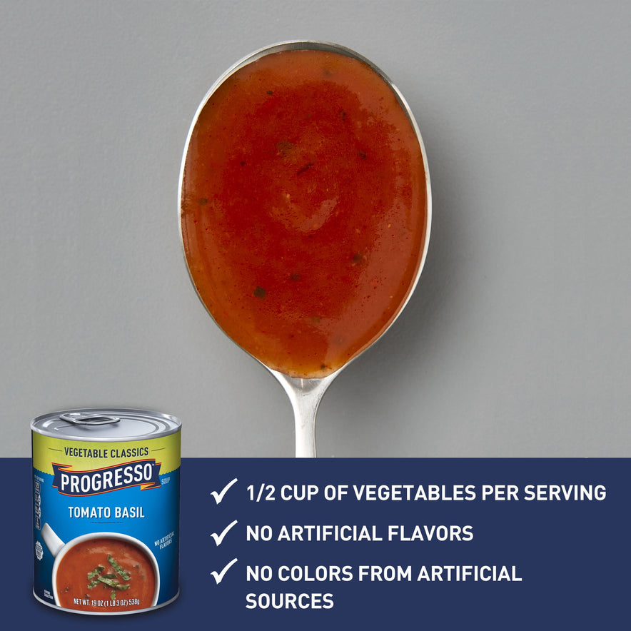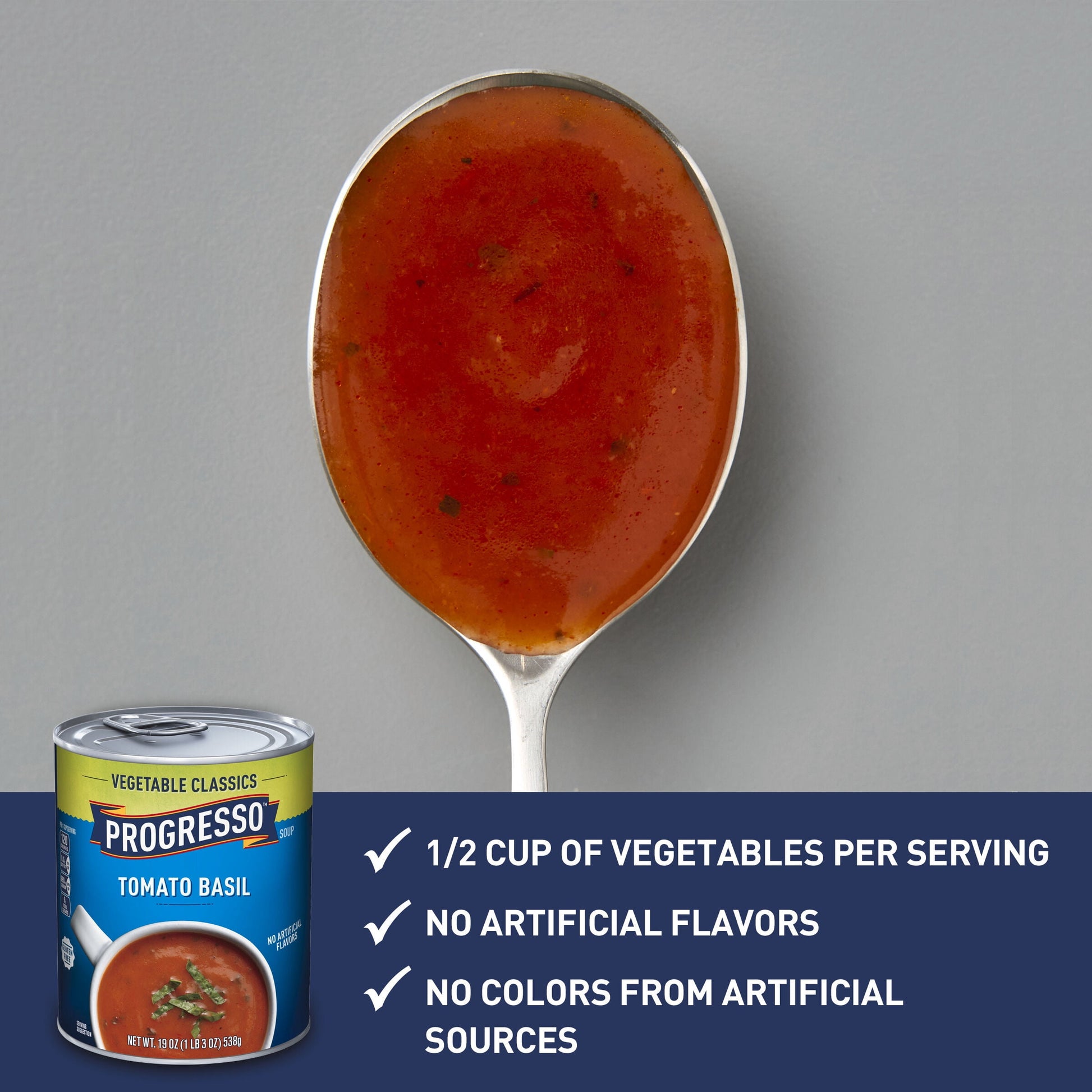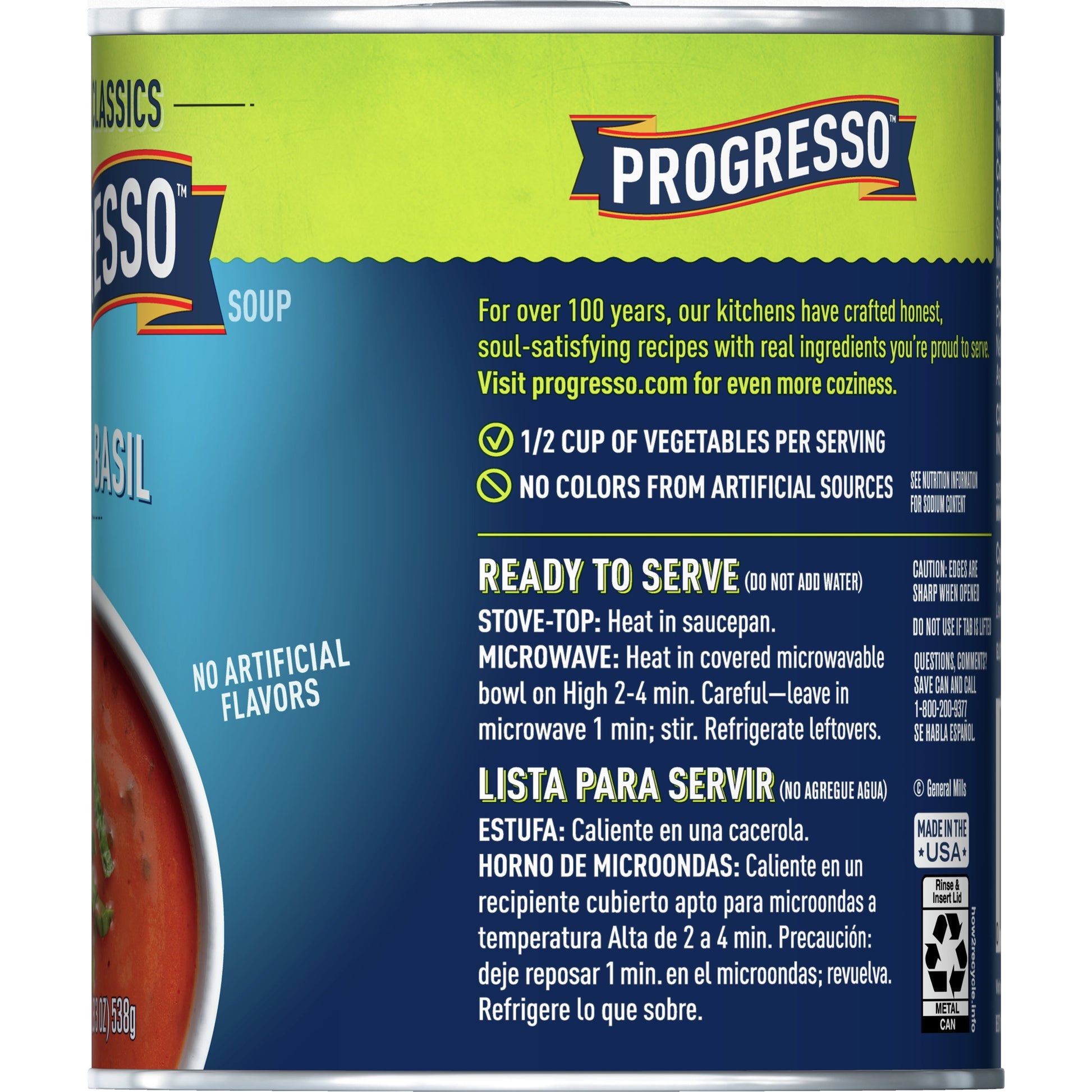 Progresso Vegetable Classics Tomato Basil Soup is a classic tomato soup packed with heartwarming goodness for days when you crave a trusted and easy meal-time option. This gluten free canned soup contains one-half cup of vegetables per serving and no artificial flavors or colors from artificial sources. Serve a bowl or cup of Progresso Tomato Basil Soup alongside freshly baked bread. Unlike instant ramen, Progresso Soup is ready to serve, no need to add water. To prepare instant soup on the stovetop, simply heat in a saucepan. For microwavable soup, heat in a microwave-safe bowl for 2-4 minutes on high. Let soup sit for 1 minute before removing from the microwave. Handle with care, stir, eat and enjoy! At Progresso, we’re passionate about making great products. We've been creating soups ranging from Chicken Noodle to Beef & Vegetable and beyond for more than 100 years. And today, Progresso still uses quality ingredients for a tasteful flavor found only in our line of canned soup products.