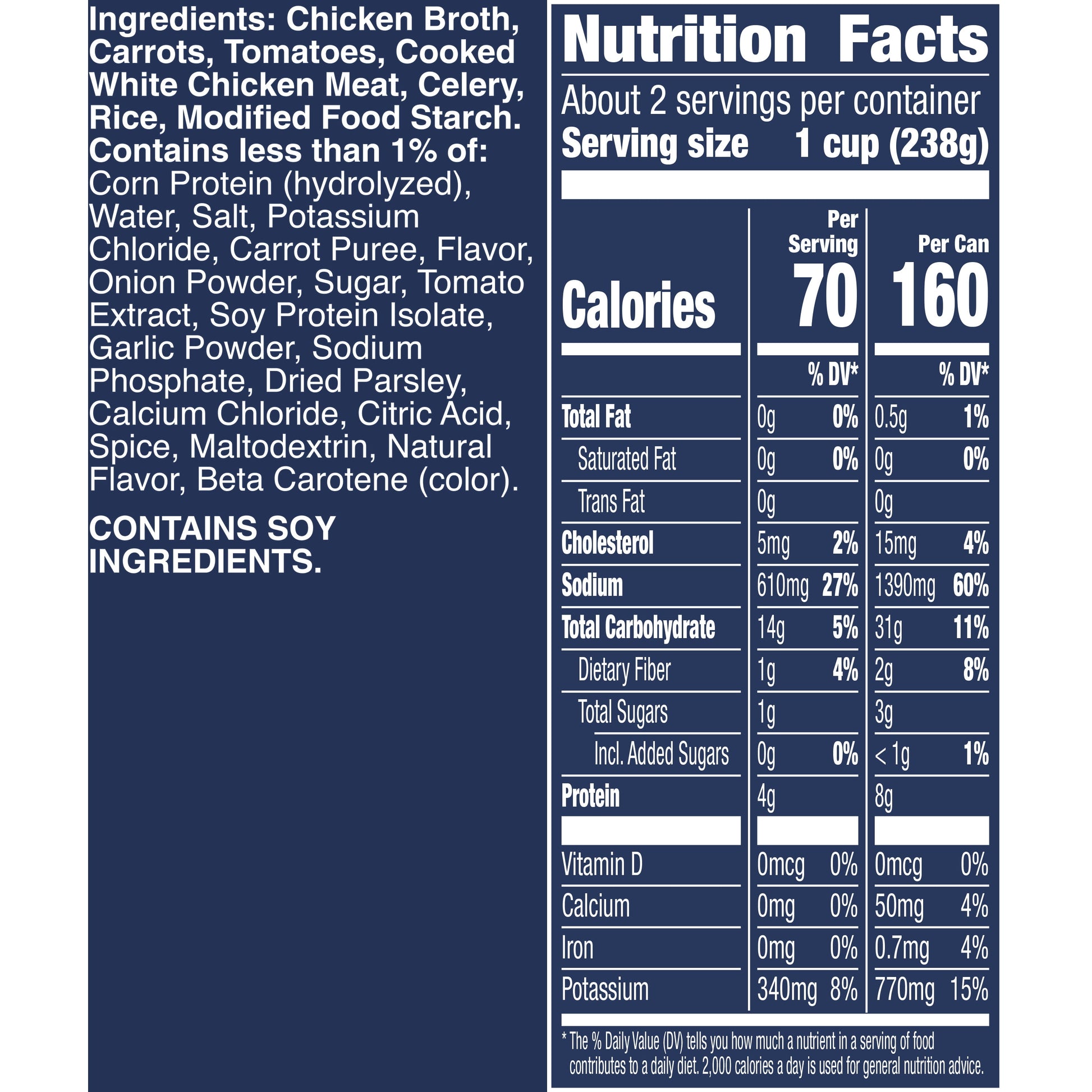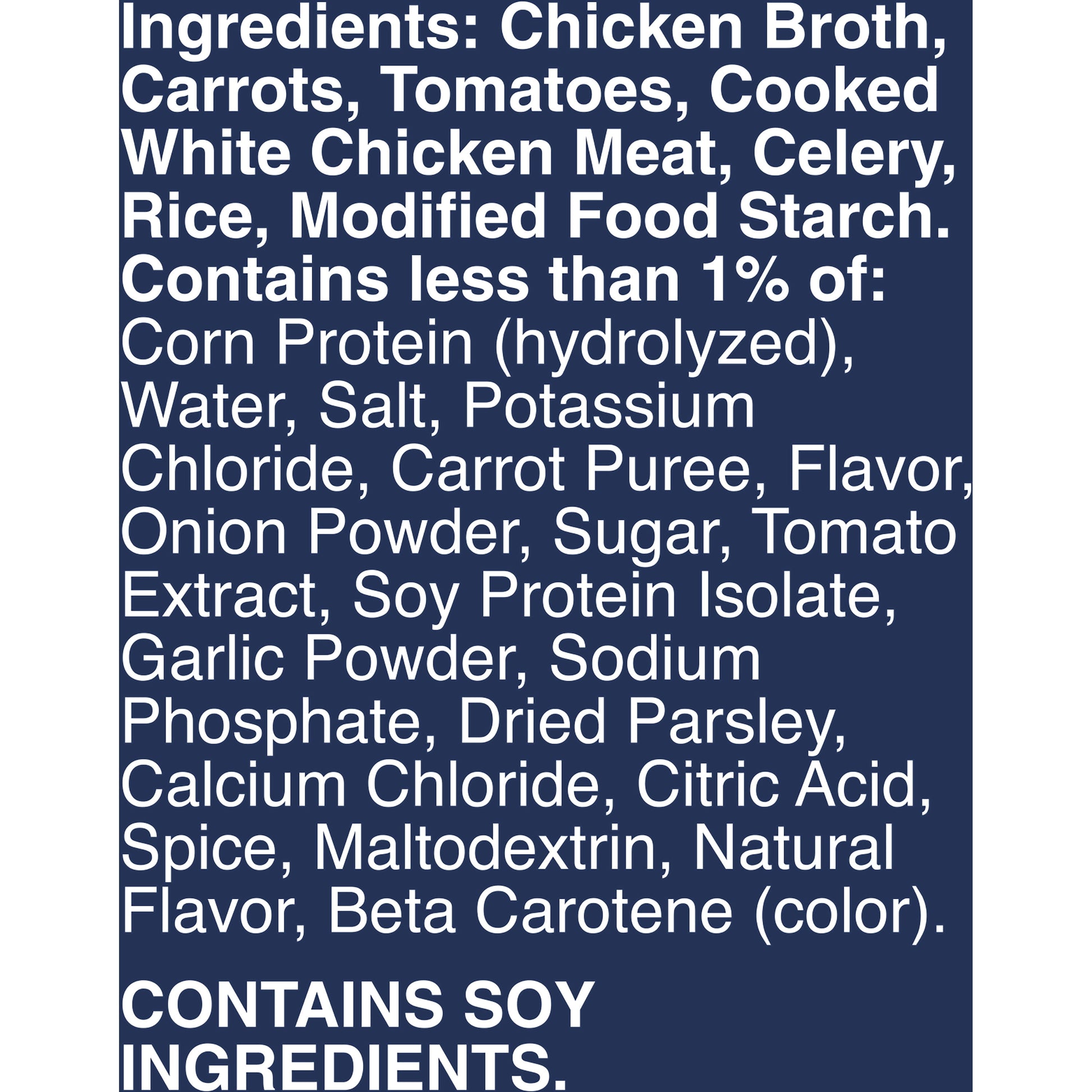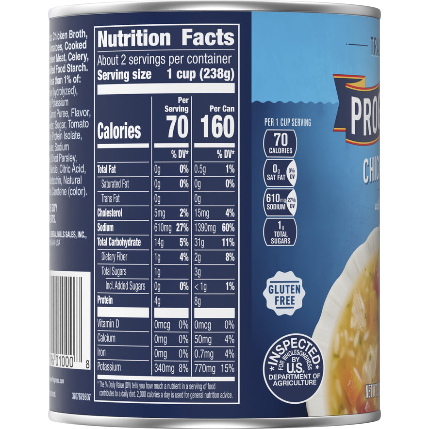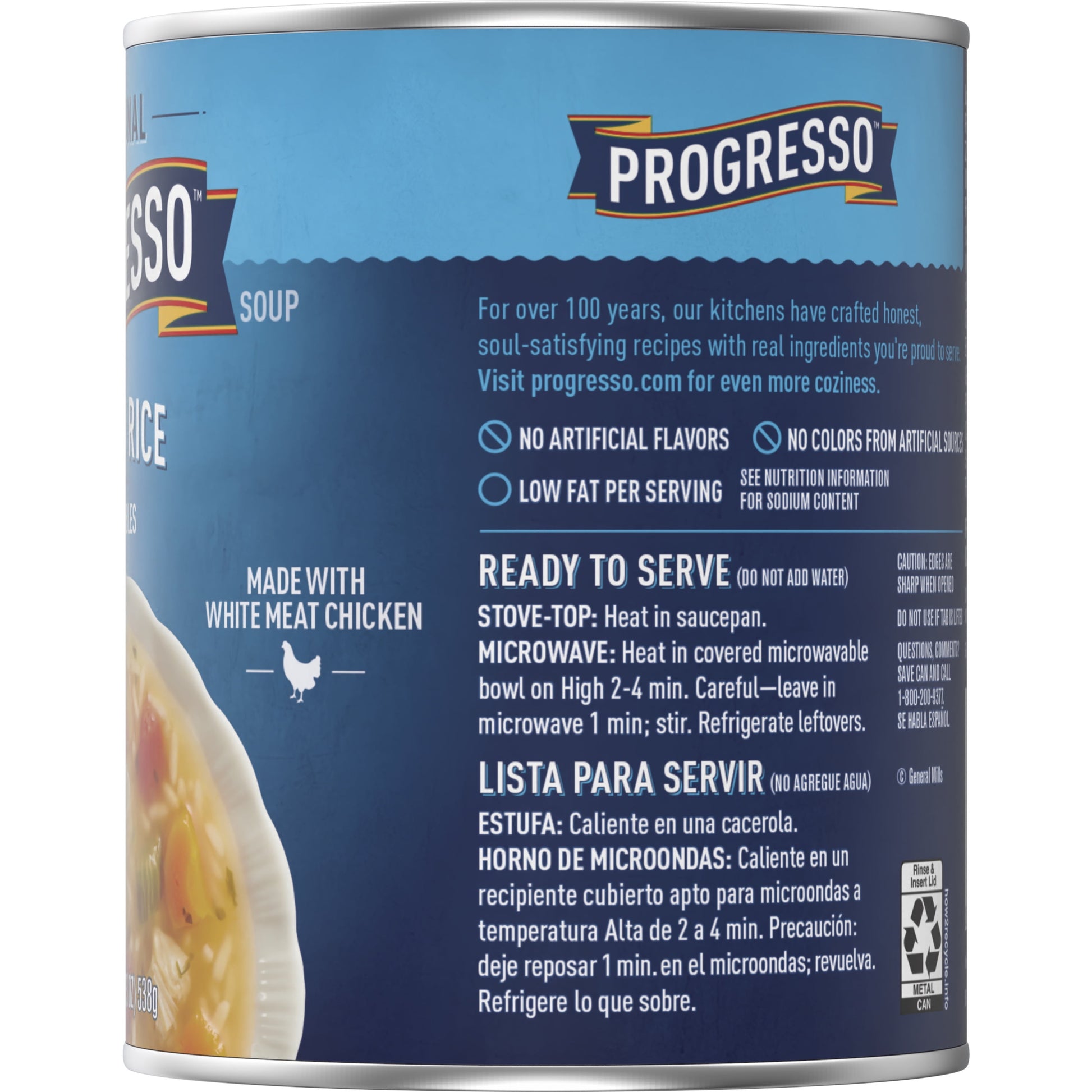 Progresso Traditional Chicken Rice Soup with Vegetables is perfect when you crave the comfort of a familiar favorite filled with wholesome ingredients. This canned soup is made with white meat chicken, rice, carrots, celery, potatoes and tomatoes. It is gluten-free and contains no artificial flavors or colors from artificial sources. Serve this chicken soup alongside freshly baked bread. Progresso Soup is ready to serve, no need to add water. To prepare instant soup on the stovetop, simply heat in a saucepan. For microwavable soup, heat in a microwave-safe bowl for 2-4 minutes on high. Let soup sit for 1 minute before removing from the microwave. Handle with care, stir, eat and enjoy!At Progresso, we're passionate about making great products. We've been creating premium soups for more than 100 years. And today, Progresso still uses quality ingredients for a tasteful flavor found only in our line of canned soup products.