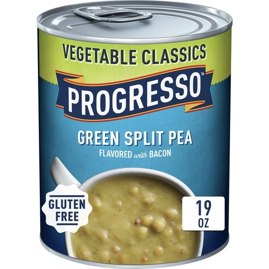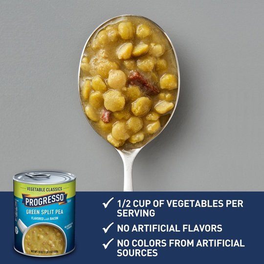Progresso Green Split Pea Soup is oh-so-delicious with flavored bacon that complements the peas to perfection. This canned soup contains one-half cup of vegetables per serving and no artificial flavors. Serve this Progresso pea soup alongside a warm grilled cheese sandwich or freshly baked bread. Progresso Soup is ready to eat, no need to add water. To prepare instant soup on the stovetop, simply heat in a saucepan. For microwavable soup, heat in a microwave-safe bowl for 2-4 minutes on high. Let soup sit for 1 minute before removing from the microwave. Handle with care, stir, eat and enjoy!At Progresso, we're passionate about making great products. We've been creating premium soups for more than 100 years. And today, Progresso still uses quality ingredients for a tasteful flavor found only in our line of canned soup products.