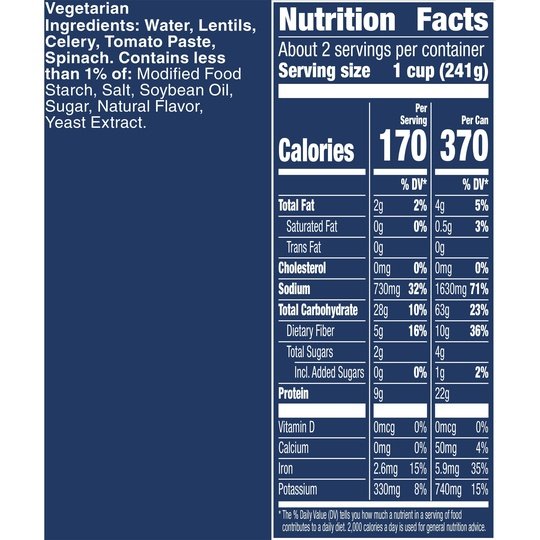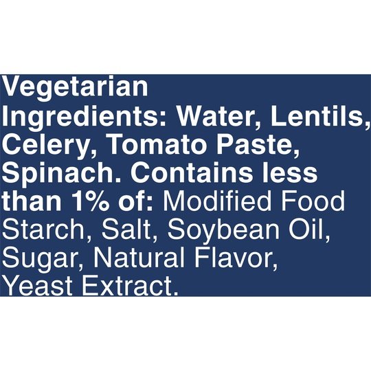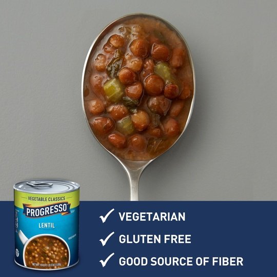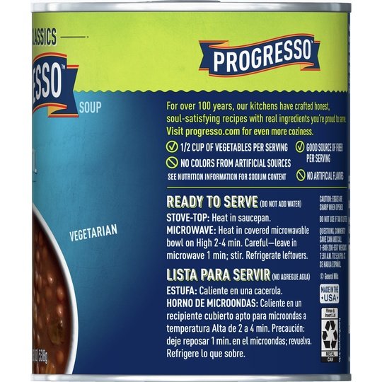 Progresso Vegetable Classics Lentil Soup is a savory soup that will warm you right up with the wholesome flavors of lentils, celery and spinach. This canned soup contains one-half cup of vegetables per serving and no artificial flavors and no colors from artificial sources. Serve Progresso Lentil Soup alongside a warm grilled cheese sandwich or freshly baked bread. Progresso Soup is ready to serve, no need to add water. To prepare instant soup on the stovetop, simply heat in a saucepan. For microwavable soup, heat in a microwave-safe bowl for 2-4 minutes on high. Let soup sit for 1 minute before removing from the microwave. Handle with care, stir, eat and enjoy!At Progresso, we?re passionate about making great products. We've been creating premium soups for more than 100 years. And today, Progresso still uses quality ingredients for a tasteful flavor found only in our line of canned soup products.