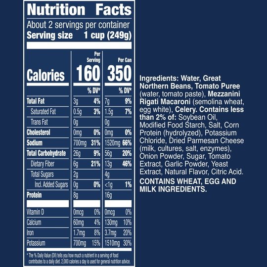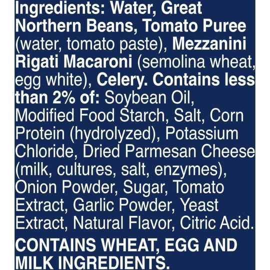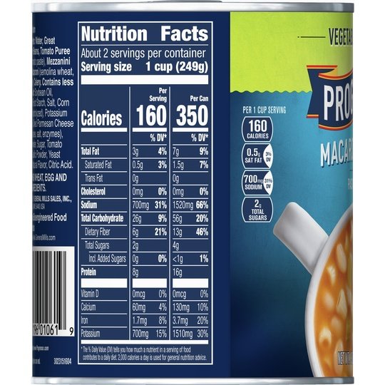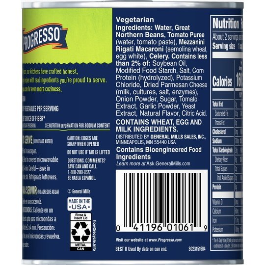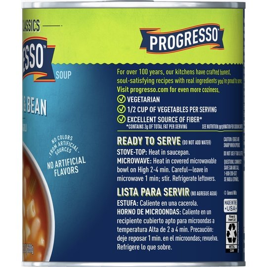 Enjoy the taste of this vegetarian vegetable soup made with Great Northern beans, macaroni and celery in a tomato-based broth. Progresso Vegetable Classics Macaroni & Bean canned soup provides a half cup of vegetables per serving and is a delicious addition to a wholesome meal. Heat up this microwavable soup in minutes, and serve alongside a tasty side salad or bowl of fruit. Even better? It has no artificial flavors or colors from artificial sources. Macaroni and bean soup is an excellent source of fiber (contains 3g total fat per serving, see nutrition information for sodium content).At Progresso, we’re passionate about making great products. We've been creating premium soups for more than 100 years. And today, Progresso still uses quality ingredients for a tasteful flavor found only in our line of canned soup products.