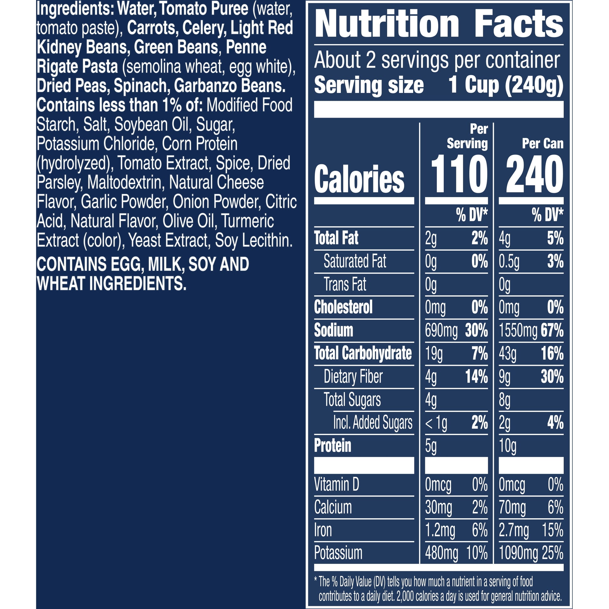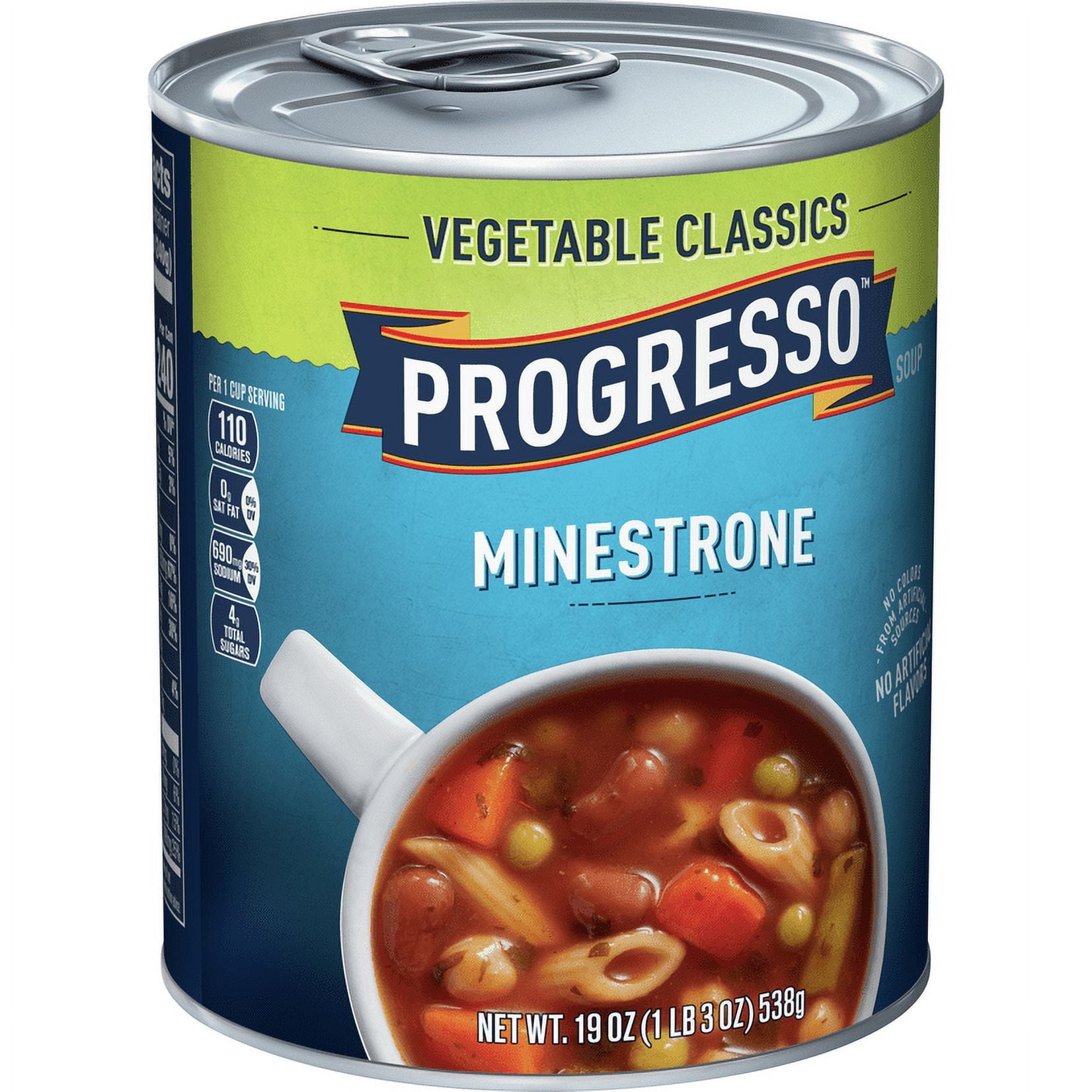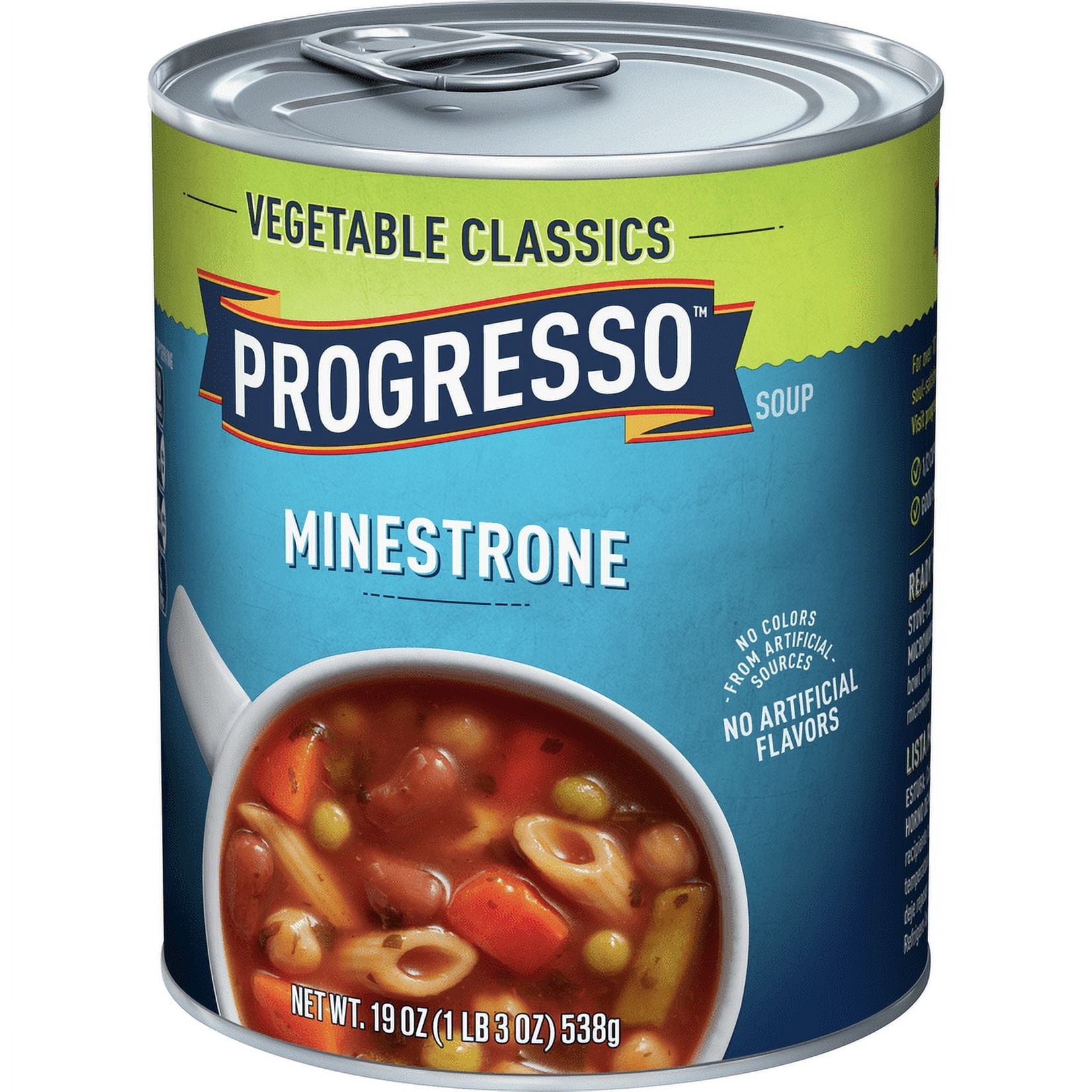 Delicious classic minestrone as you remember it, Progresso Vegetable Classics Minestrone Soup is packed with hearty beans, vegetables and penne rigate pasta. This canned vegetarian soup has 110 calories and one-half cup of vegetables per serving. It is a good source of fiber and contains no artificial flavors or colors from artificial sources. Serve Progresso minestrone soup alongside freshly baked bread. Progresso Soup is ready to serve, no need to add water. To prepare instant soup on the stovetop, simply heat in a saucepan. For microwavable soup, heat in a microwave-safe bowl for 2-4 minutes on high. Let soup sit for 1 minute before removing from the microwave. Handle with care, stir, eat and enjoy!At Progresso, we’re passionate about making great products. We've been creating premium soups for more than 100 years. And today, Progresso still uses quality ingredients for a tasteful flavor found only in our line of canned soup products.