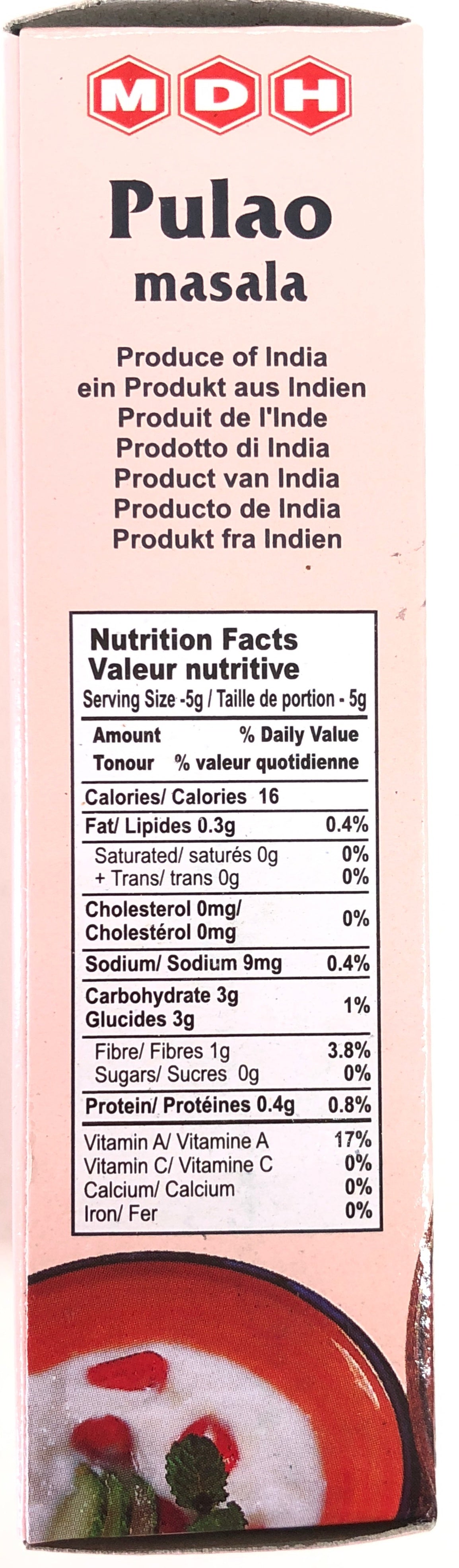 MDH Pulao Masala 50 g. Also called Pullao or Biryani Masala. A spice blend for making a lightly spiced vegetable rice dish. Ingredients : Cassia, Black Pepper, Cardamom seeds, Cloves, Caraway, Cardamom green, Mace.