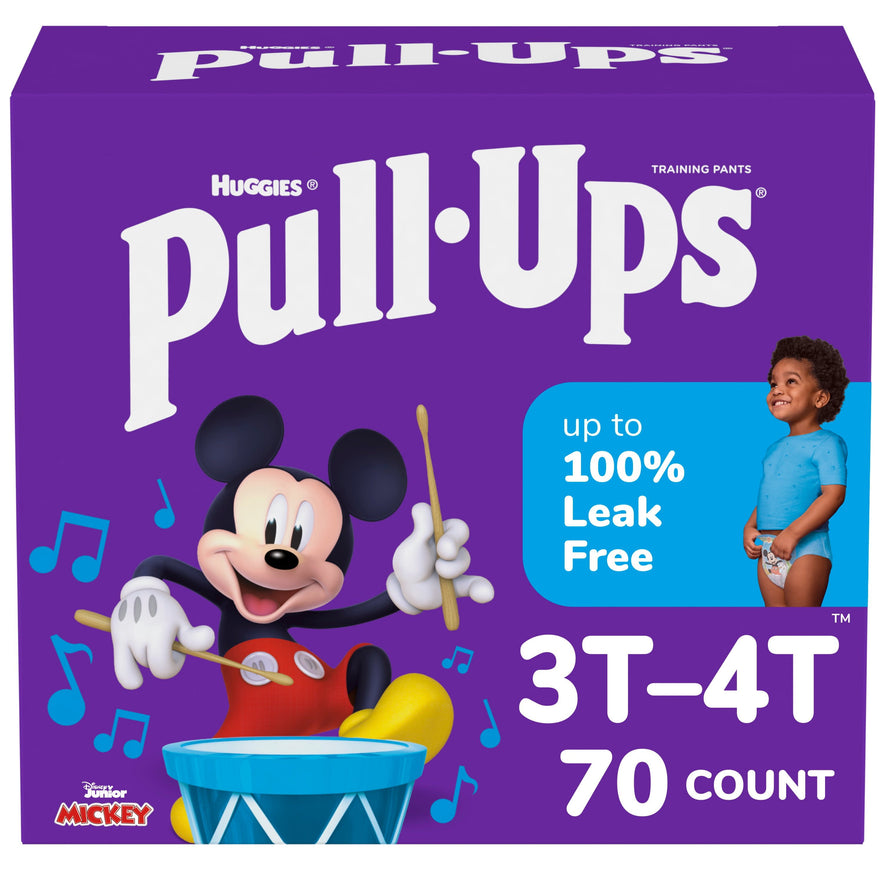 Start potty training with Pull-Ups Training Pants for Boys! Each training underwear delivers easy changes with refastenable sides, allowing you to keep pants and shoes on your toddler. Pull-Ups Potty Training Pants feature up to 100% leak-free protection and targeted absorbency where boys need it most. Made with soft and breathable materials, these boys’ training pants are comfy and flexible, with an underwear-like fit to help make potty training easy. Not only do they provide all-around coverage, but are designed for little hands to easily pull up and down for Big Kid™ independence. Each pack includes two exclusive music designs featuring Disney's Mickey Mouse, with instrument graphics that fade when wet to help motivate your child to stay dry. Making music with Mickey Mouse comes to life with interactive digital tools. When your child is ready to begin his potty training journey, the Pull-Ups brand can help. Visit the Pull-Ups website for expert potty training tips and resources. We've helped train 60 million Big Kids and counting!* Pull-Ups Boys' Training Underwear are available in sizes 2T-3T (16-34 lbs), 3T-4T (32-40 lbs), 4T-5T (38-50 lbs) and 5T-6T (50+ lbs). (*US and CA)