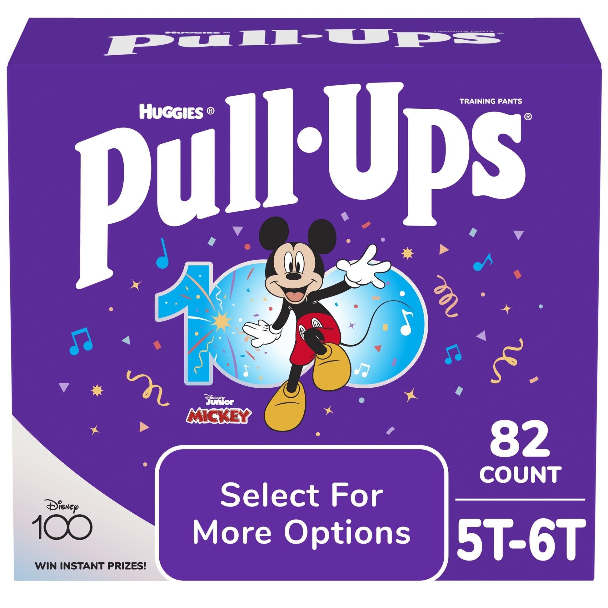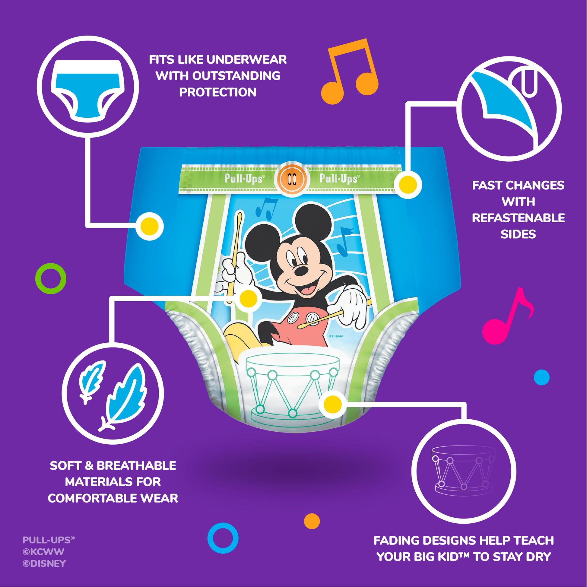 Potty training is fast, fun and easy with Pull-Ups Training Pants! Our Pull-Ups Potty Training Pants for boys are made with soft and breathable materials, providing extra comfort for your child throughout the day, whether they're at home, school or daycare. The training underwear is also flexible, with an underwear-like fit for easy potty training and outstanding protection. Plus, Pull-Ups Potty Training Pants Boys' offer all-around coverage and showcase stretchy sides that your child can easily move up and down to help them feel like a Big Kid. Pull-Ups is the only brand with refastenable sides for easy changes, while the adjustable sides also let you customize your child's waistband and easily check for messes. Each pack includes two exclusive music designs featuring Disney's Mickey Mouse, with instrument graphics that fade when wet to help motivate your child to stay dry. Tell the story of how Mickey Mouse loves making music and your child can help keep the music going! Making music with Mickey Mouse comes to life with interactive digital tools and fun extras like an inside-the-box coloring mat. When your child is ready to begin his potty training journey, the Pull-Ups brand can help. Visit the Pull-Ups website for expert potty training tips and resources. We've helped train 60 million Big Kids and counting!* Pull-Ups Boys' Training Underwear are available in sizes 2T-3T (16-34 lbs), 3T-4T (32-40 lbs), 4T-5T (38-50 lbs) and 5T-6T (50+ lbs). (*US and CA)