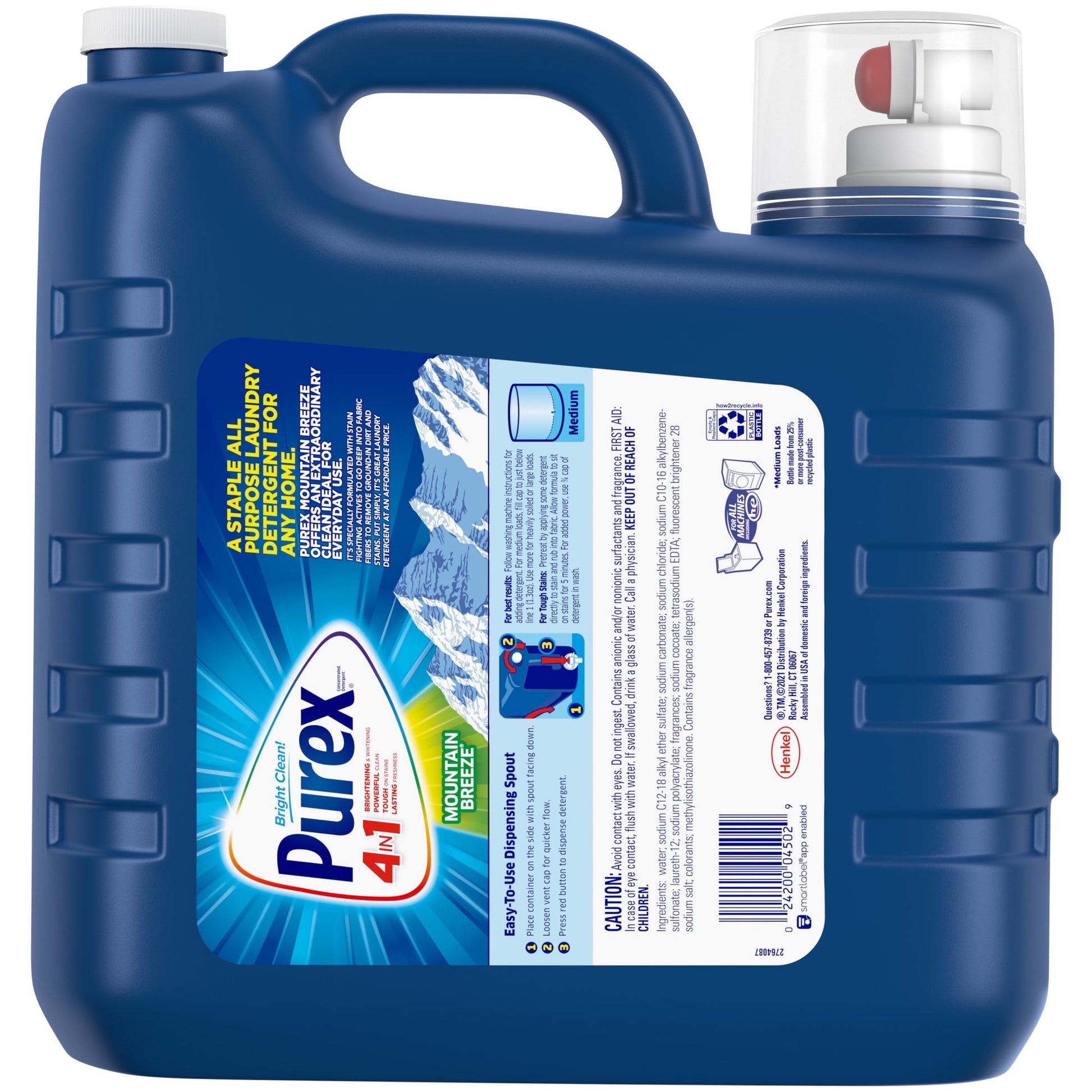 Heighten your senses with the refreshing outdoor scent of crisp mountain air and springtime floral blooms found in Purex Mountain Breeze liquid laundry detergent. A staple laundry supply for any home – Purex liquid laundry detergent is ideal for everyday use. It’s specially formulated with stain fighting actives to go deep into fabric fibers to remove ground-in dirt and stains. Put simply, it’s great laundry detergent at an affordable price. Purex Liquid Laundry Detergent - an extraordinary clean from an all-purpose laundry detergent. Purex – Bright Clean, Smart Value. Easy-to-use dispensing spout.1. Place container on side with spout facing down.2. Loosen vent cap for quicker flow.3. Press red button to dispense detergent. For best results: Follow washing machine instructions for adding detergent. For regular loads, fill cap to level 1 (1.5 oz.). Use more for heavily soiled or large loads. This package includes one 312 ounce bottle of Purex Mountain Breeze liquid laundry detergent enough for 240 loads.
