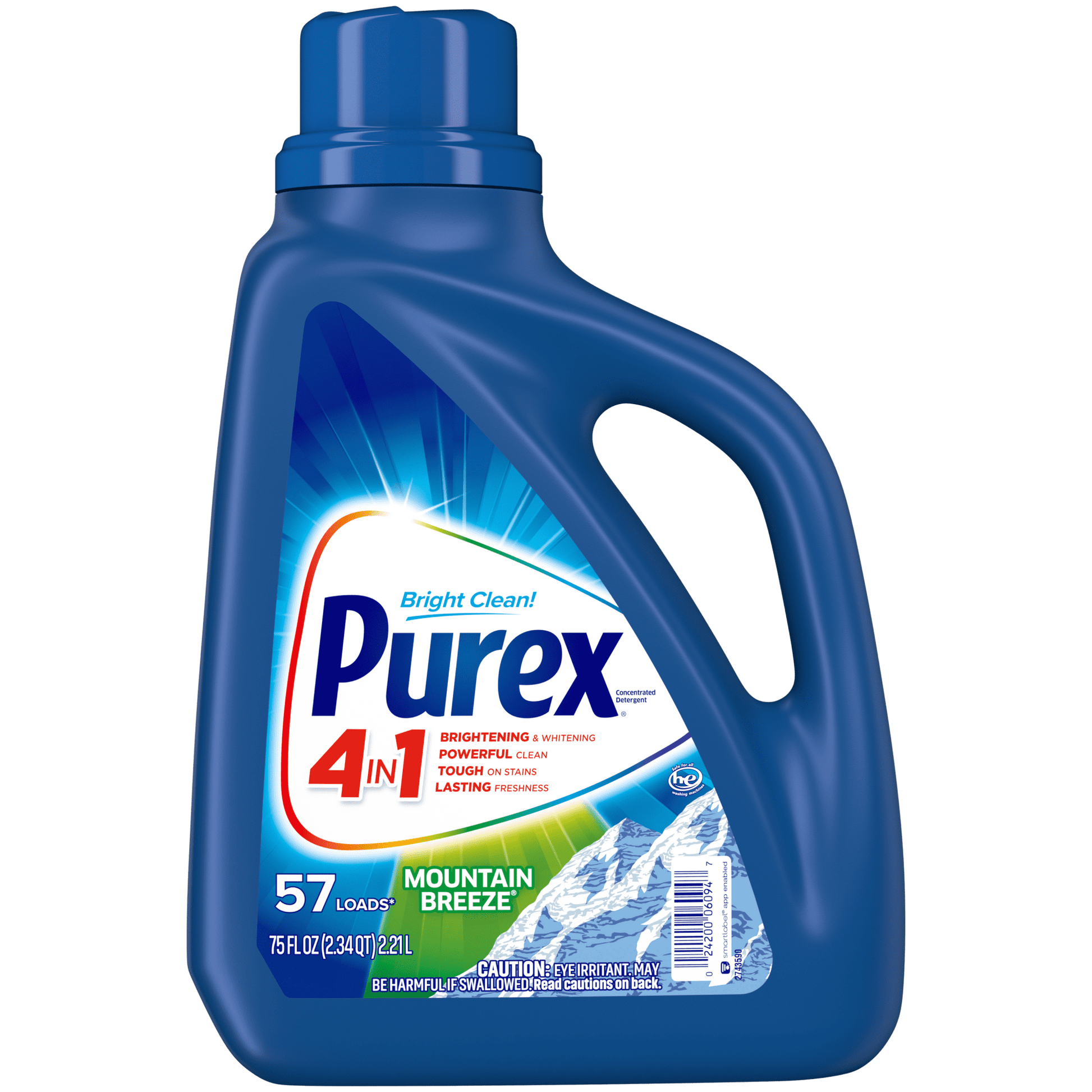 Heighten your senses with the refreshing outdoor scent of crisp mountain air and springtime floral blooms found in Purex Mountain Breeze liquid laundry detergent. A staple laundry supply for any home – Purex liquid laundry detergent is ideal for everyday use. It’s specially formulated with stain fighting actives to go deep into fabric fibers to remove ground-in dirt and stains. Put simply, it’s great laundry detergent at an affordable price. Purex Liquid Laundry Detergent - an extraordinary clean from an all-purpose laundry detergent. Purex – Bright Clean, Smart Value. Easy-to-use dispensing spout.1. Place container on side with spout facing down.2. Loosen vent cap for quicker flow.3. Press red button to dispense detergent.For best results: Follow washing machine instructions for adding detergent. For regular loads, fill cap to level 1 (1.5 oz.). Use more for heavily soiled or large loads. This package includes one 75 ounce bottle of Purex Mountain Breeze liquid laundry detergent enough for 57 loads.
