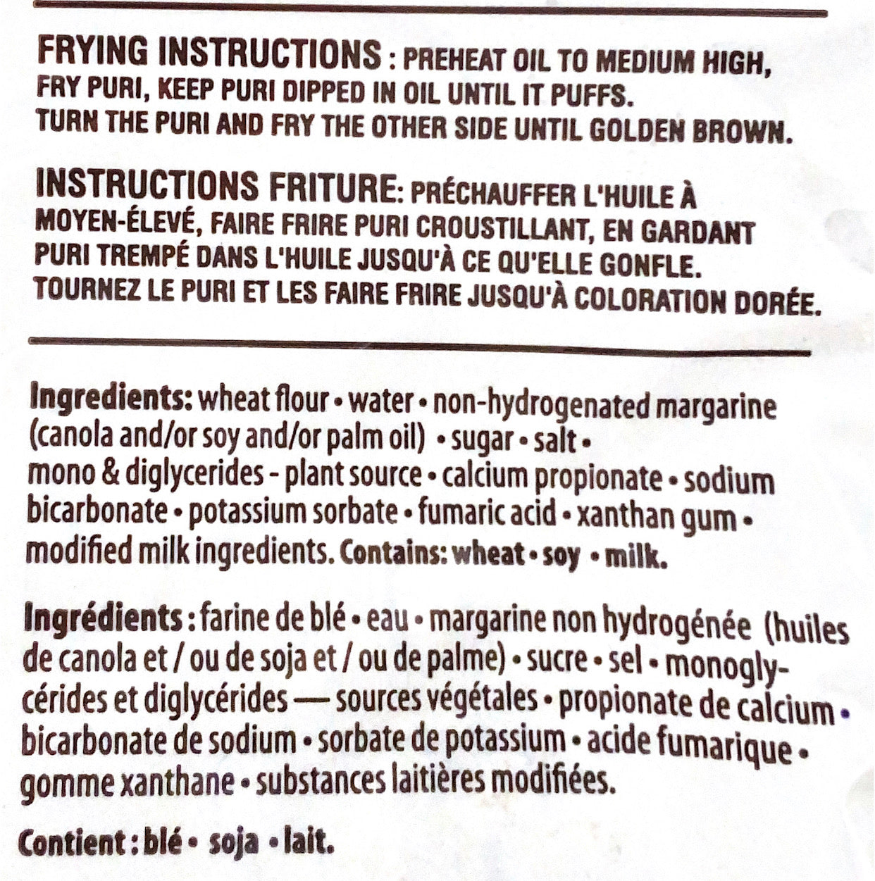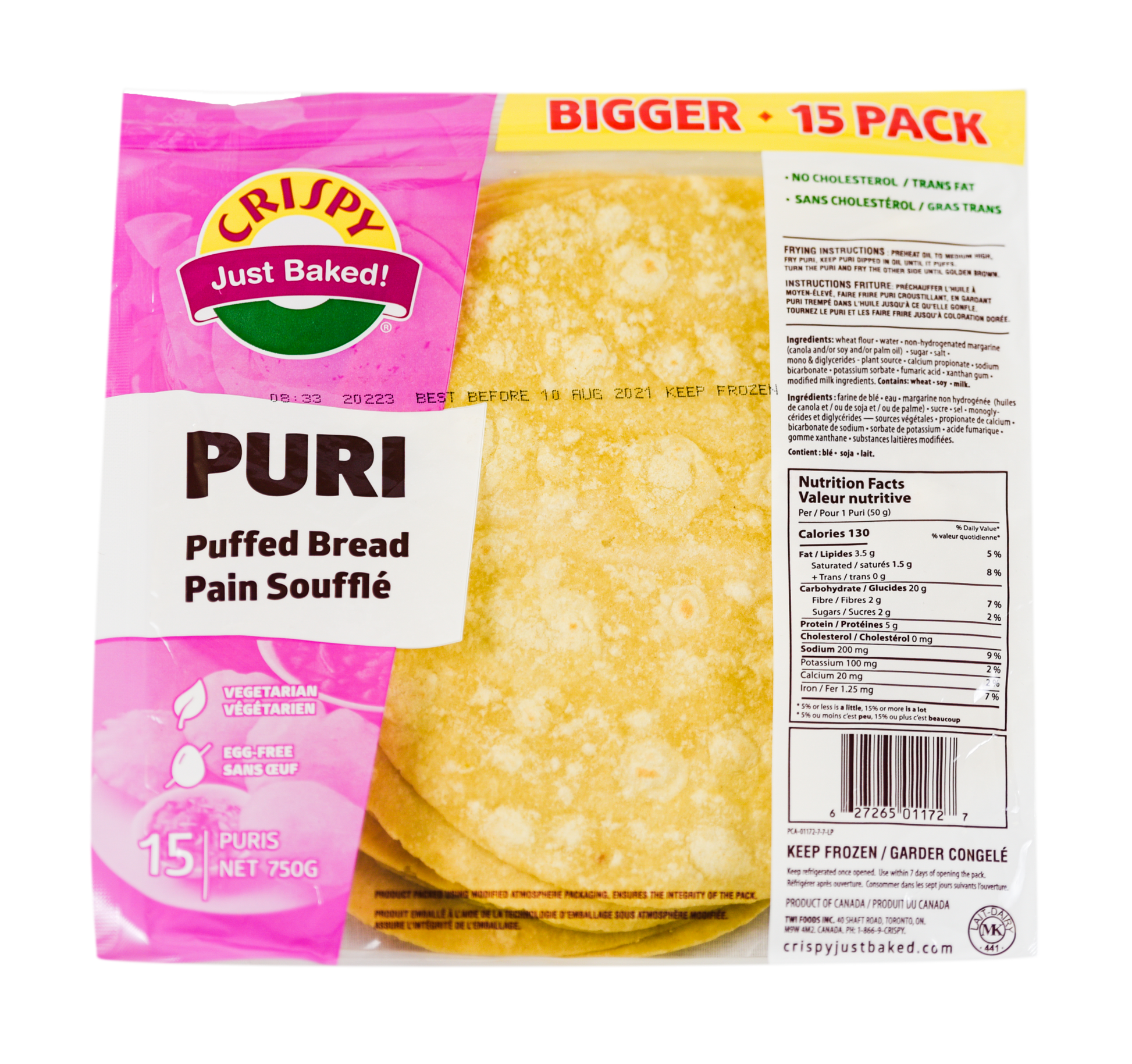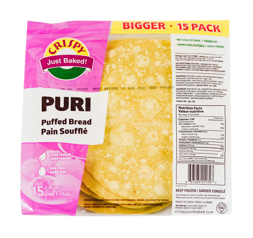 Crispy's Puris can be purchased as flat rounds of flour. To prepare, one would deep fry Puris in oil until they puff up. These are eaten for breakfast, as a snack, or as a light meal. Puris are usually served with a side potato dish, dry or curried.