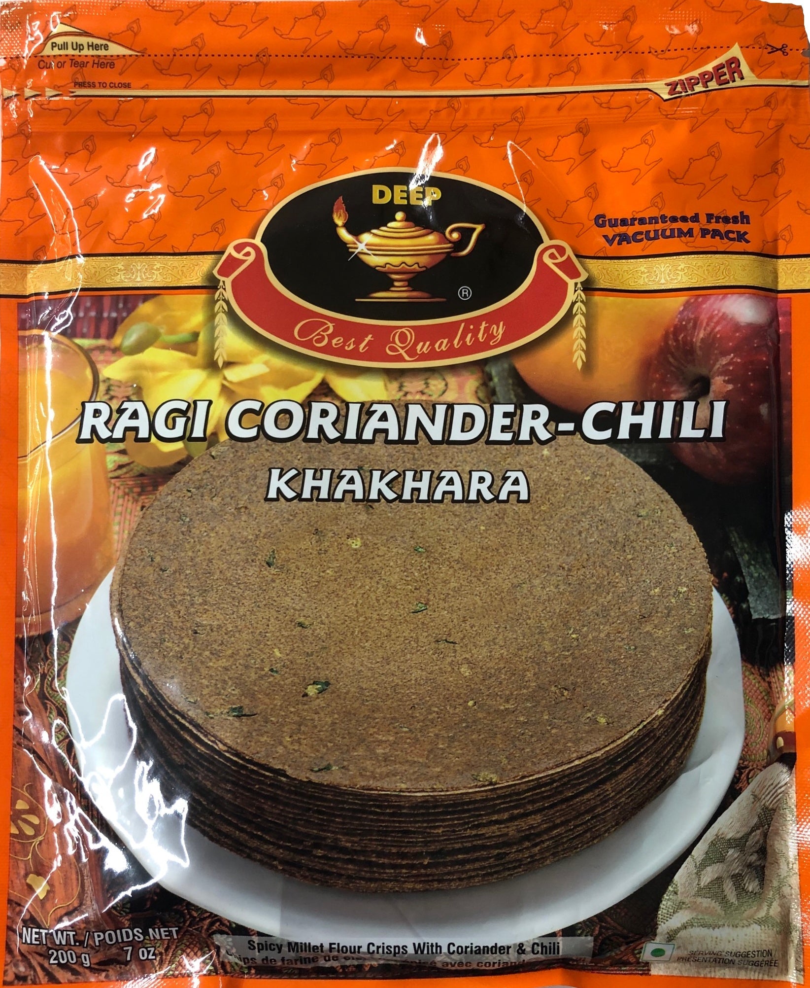 Ingredients: finger millet (ragi) flour, wheat flour, palmolein oil, red chili powder, green chili, coriander leaves, salt, ginger, turmeric.