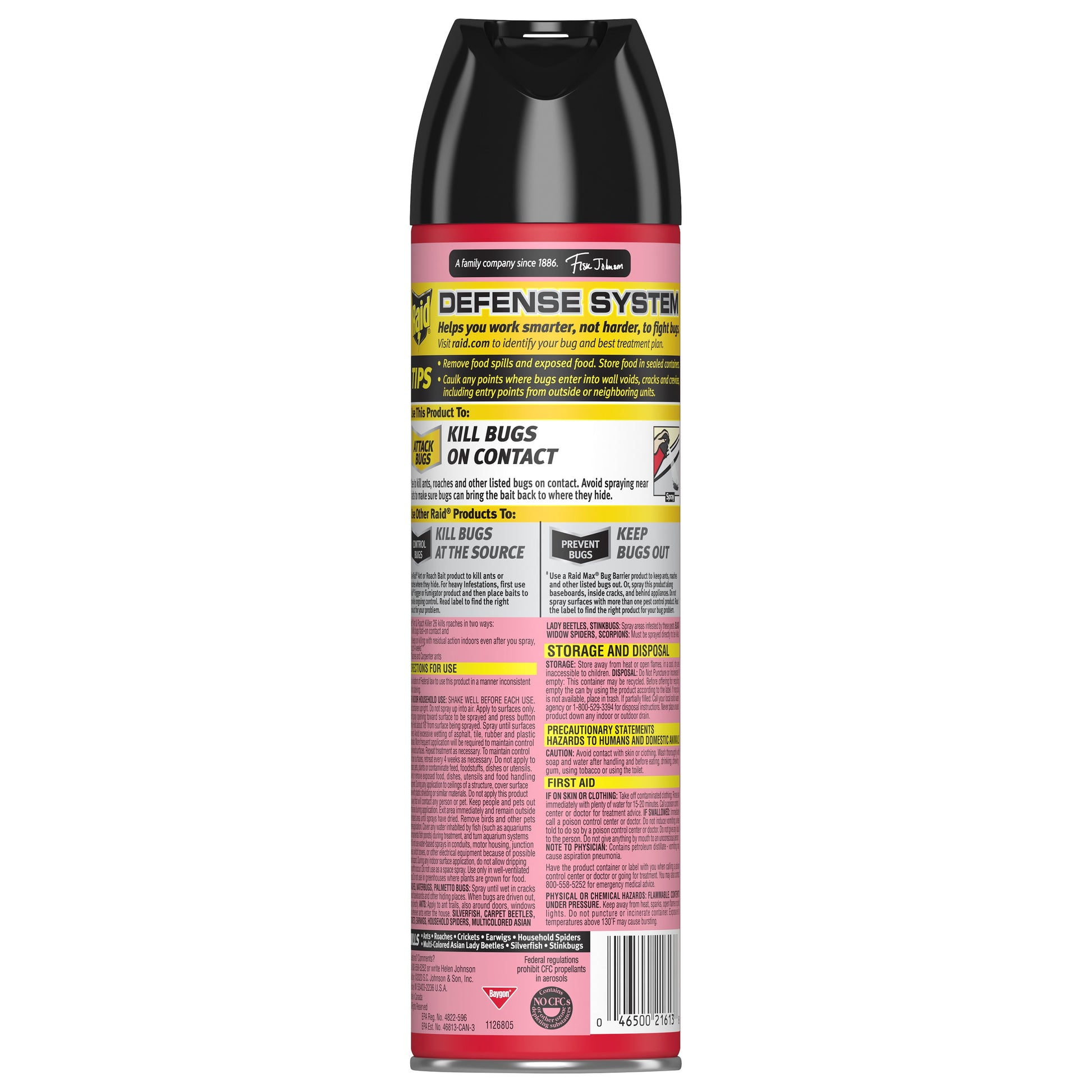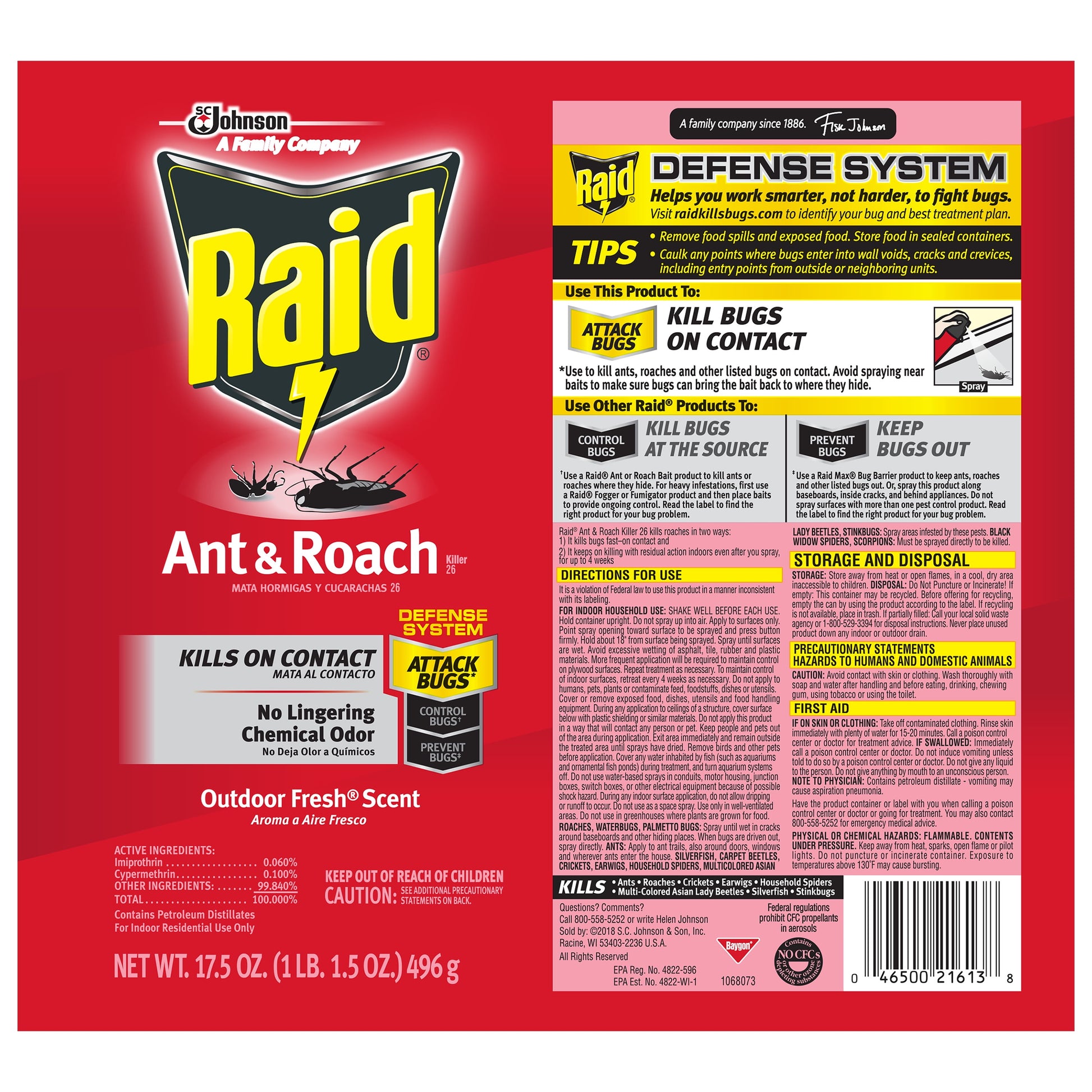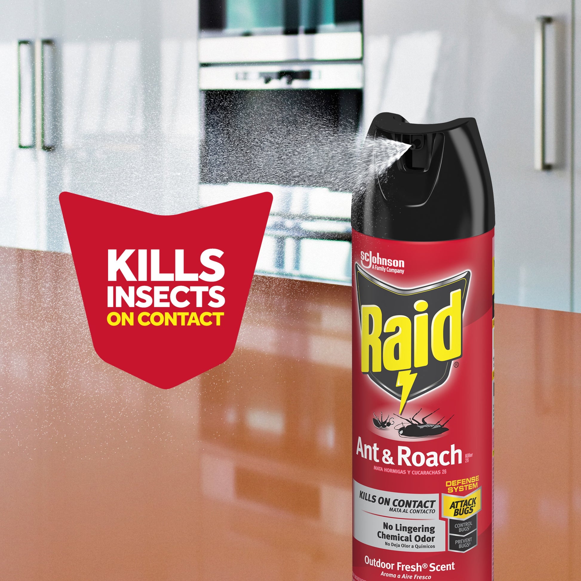 Raid® Ant & Roach 26 kills roaches and ants on contact within 30 seconds and keeps killing roaches and carpenter ants with residual action for up to 6 weeks. Take back your home with this ant & roach spray.The insecticide can be applied to surfaces where ants, cockroaches and other bugs are found. The bug killer is effective against a wide variety of insects including cockroaches, ants, silverfish, crickets, earwigs, household spiders, multicolored Asian lady beetles and stinkbugs.