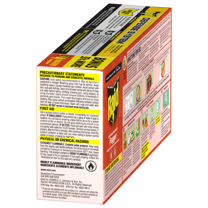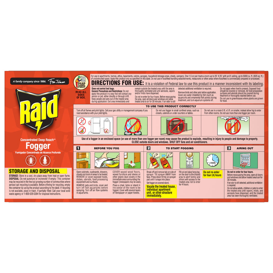 Raid Concentrated Deep Reach Fogger uses a bug killing fog to kill roaches and fleas in the hard-to-reach areas of your home. The fog treats an entire room with residual killing action against roaches for up to 2 months. The fog covers an area of up to 5,000 cubic feet and can even dissipate into closets and small areas within a room.
