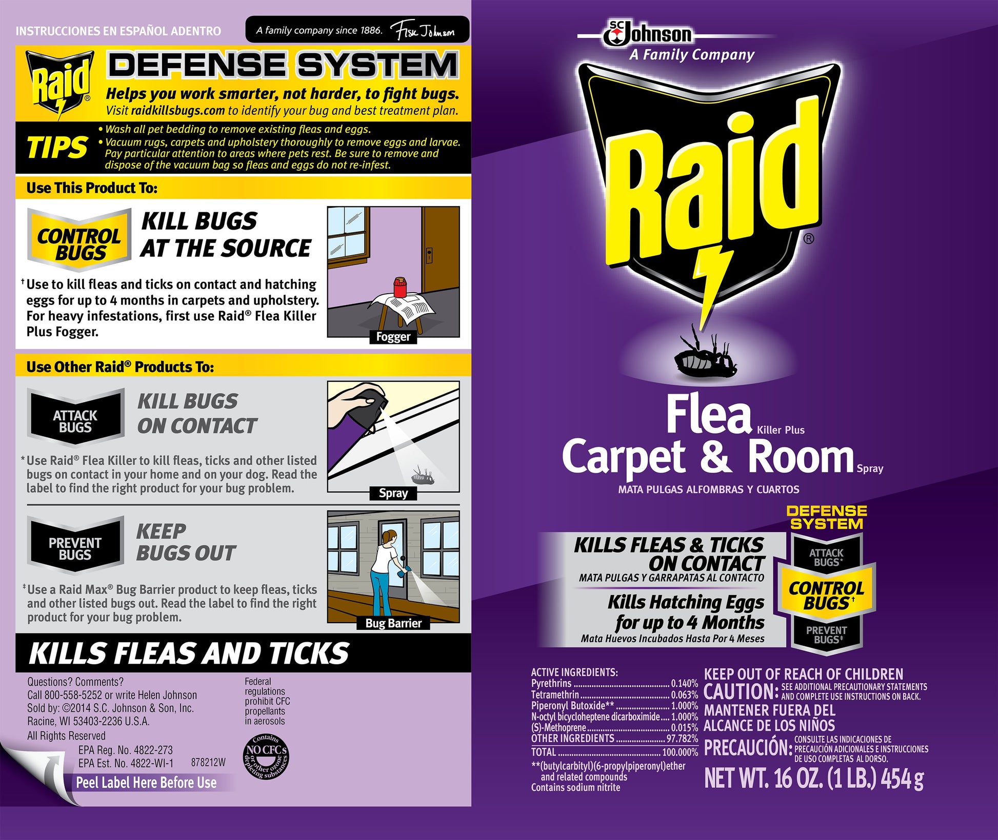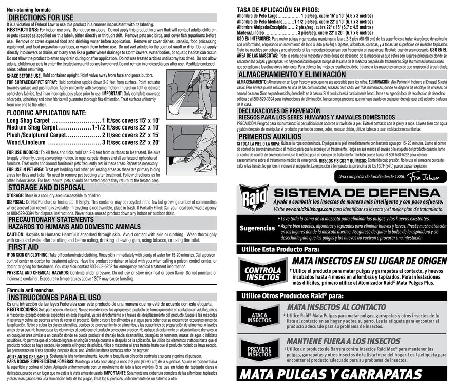 Raid Flea Killer Plus Carpet & Room Spray kills fleas, ticks, and their eggs on contact. Shake well before using and apply indoors only, ventilating after treatment. Flea killer can be applied to pet beds, when used as directed.Our flea spray is designed to battle heavy flea infestations when used with other Raid Flea Killer Plus Products. This flea insecticide kills adult fleas and ticks on contact and kills hatching eggs for up to four months on carpet and upholstery. Non-staining formula: test in an inconspicuous area prior to use on light or delicate fabrics.