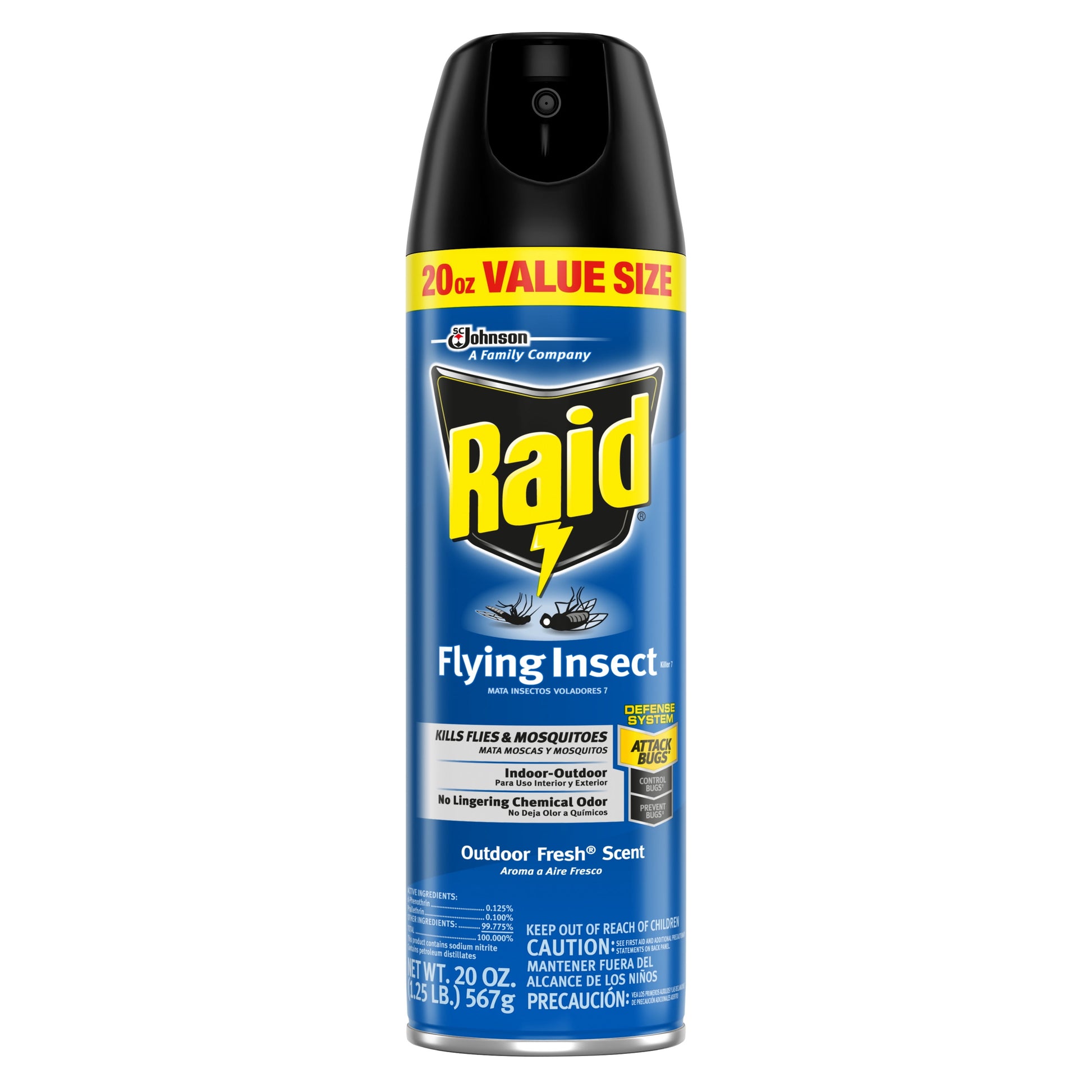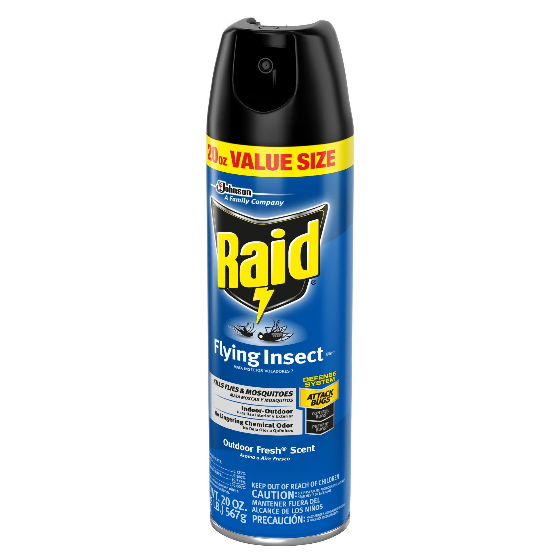 Raid Flying Insect Killer is specially formulated to kill a number of flying insects: Asian lady beetles, boxelder bugs, flies, fruit flies, hornets, mosquitoes, non-biting gnats, small flying moths, wasps, and yellow jackets. Raid flying insect spray kills on contact and can be used both indoors and outdoors. Attack flies and mosquitoes with no lingering chemical order and an Outdoor Fresh scent. Raid Defense System helps you work smarter, not harder, to fight bugs.