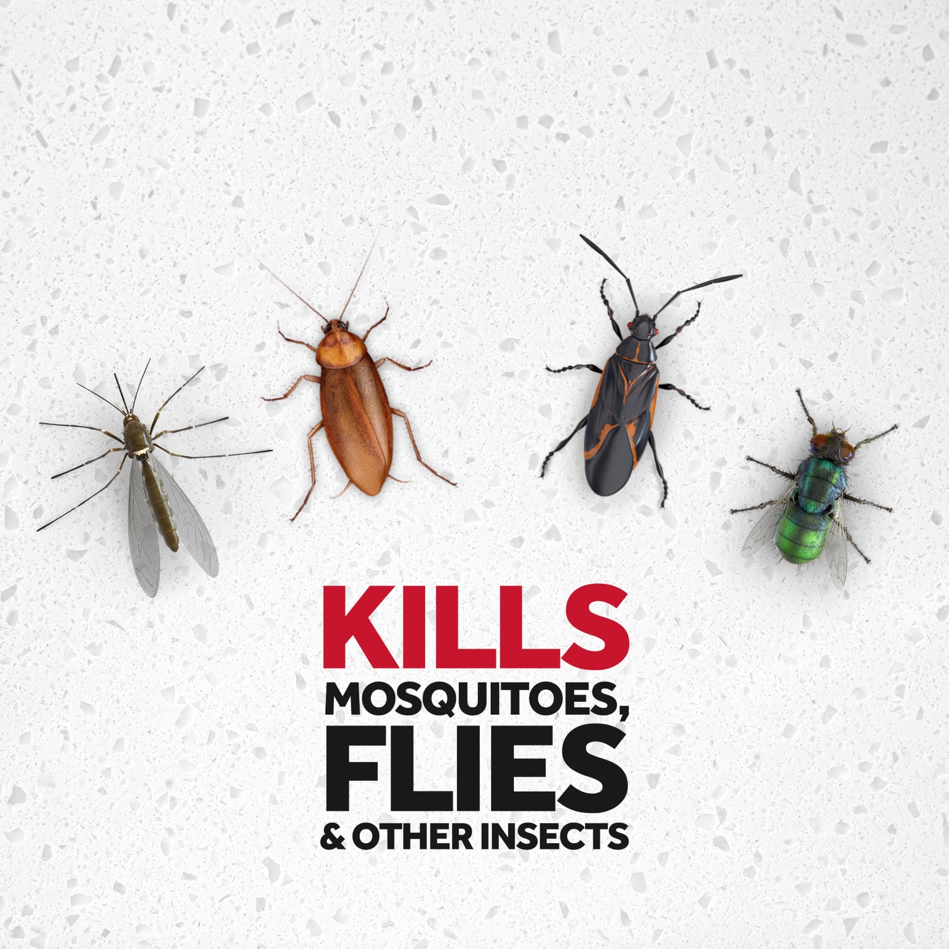 Apply killer spray where ants, roaches, spiders, flies, and other listed bugs may be infesting