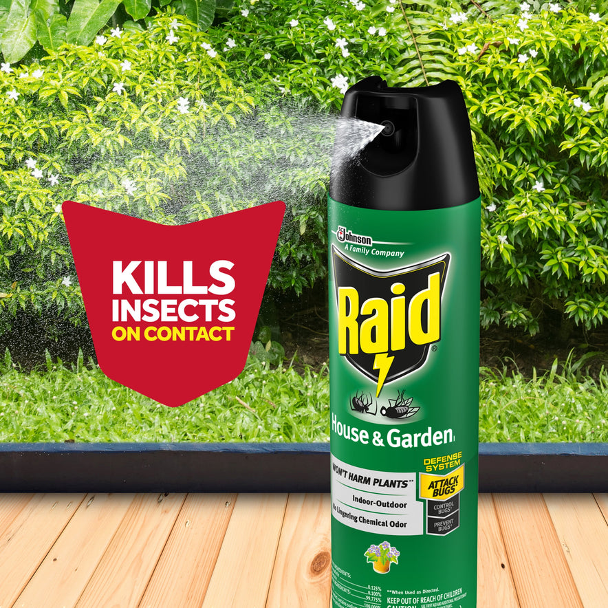 Raid House & Garden Bug Spray kills bugs on contact and won't damage house or garden plants
