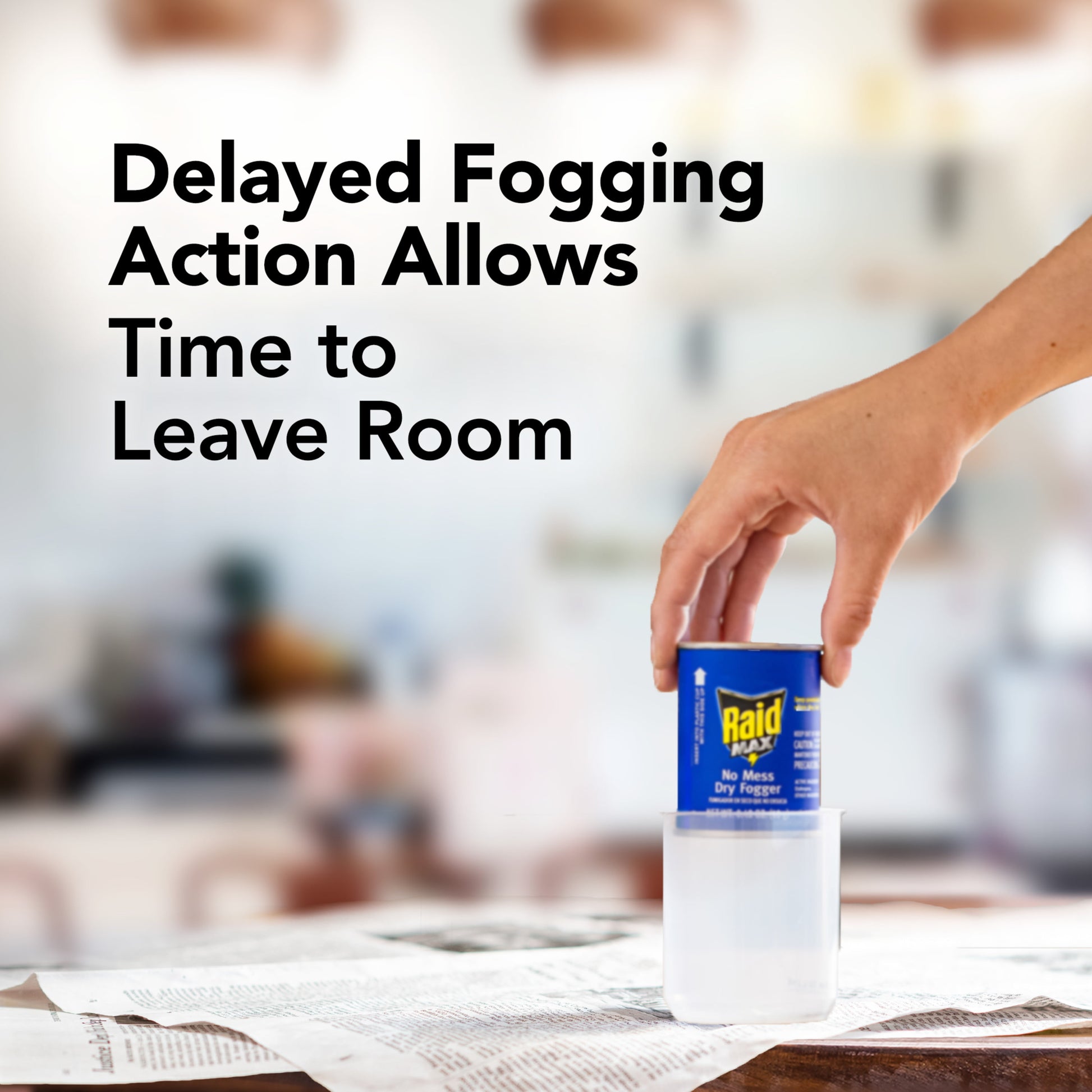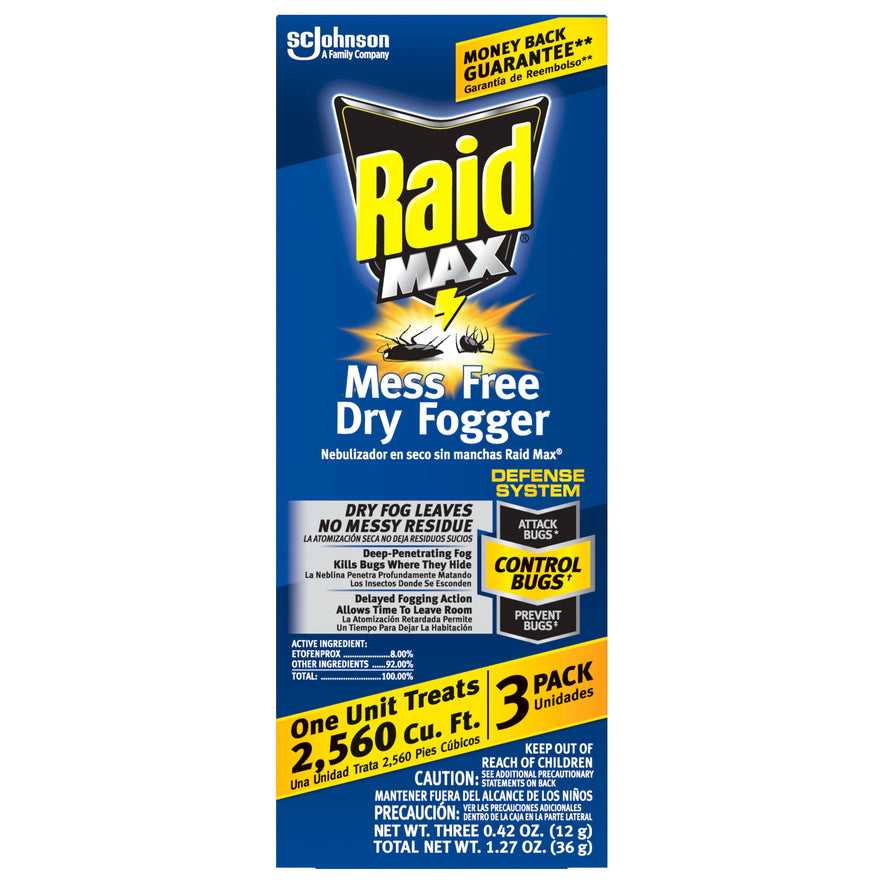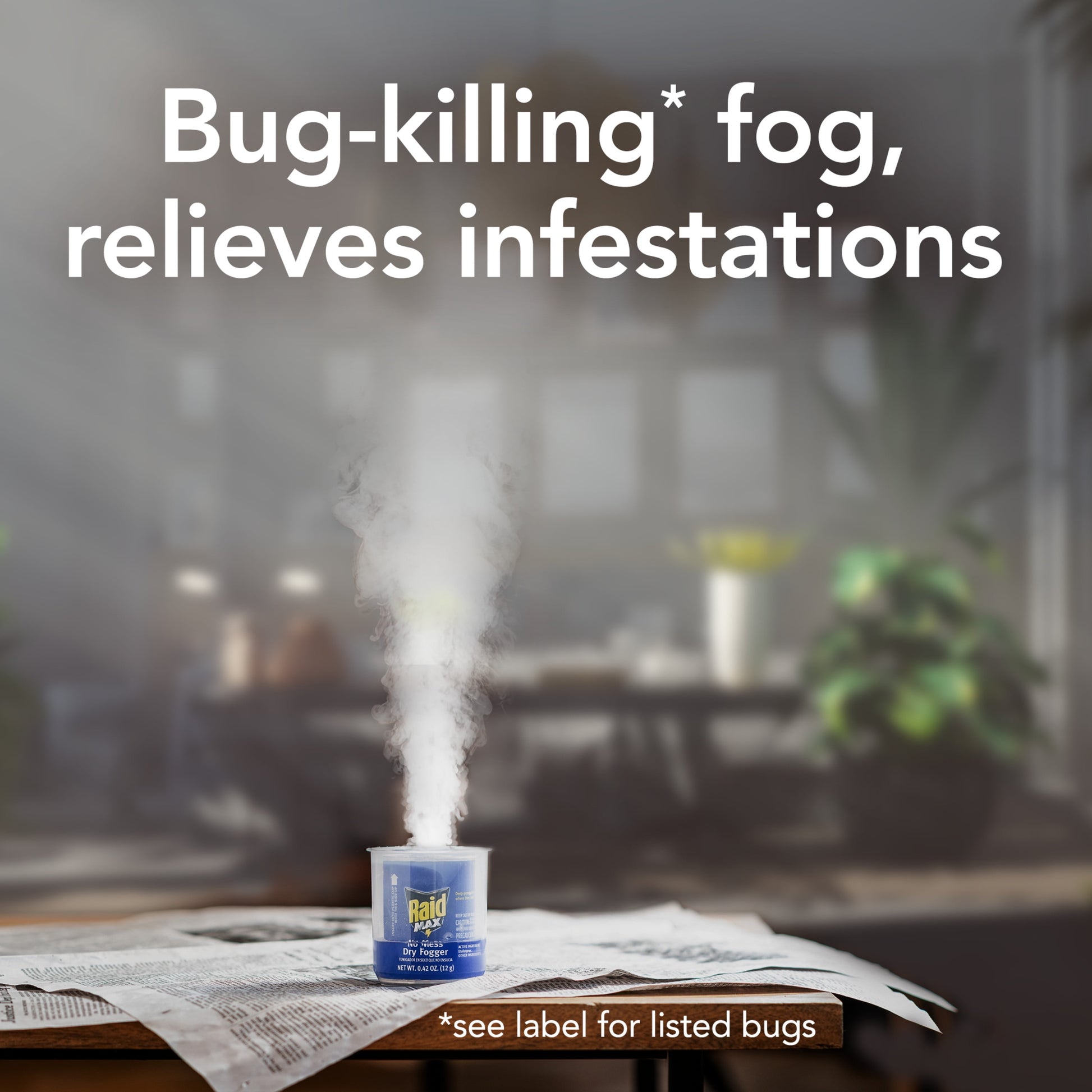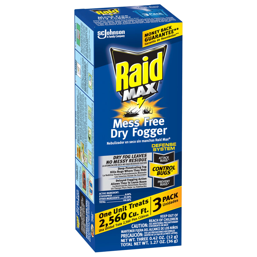 Raid MAX Mess Free Dry Fogger helps relieve heavy indoor infestations with its deep-penetrating fog. It uses a mess free dry fog that leaves no residue.For best results, open your cabinets, drawers and closets before use. Be sure to close the windows and doors. Once it starts spraying, wait 4 hours before returning.It's an ant killer, roach killer, and mosquito killer. It also works on carpet beetles, crickets, earwigs, gnats, palmetto bugs, pillbugs, saw toothed grain beetles, silverfish, small flying moths, ticks, wasps, water bugs and yellow jackets.
