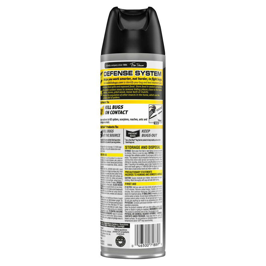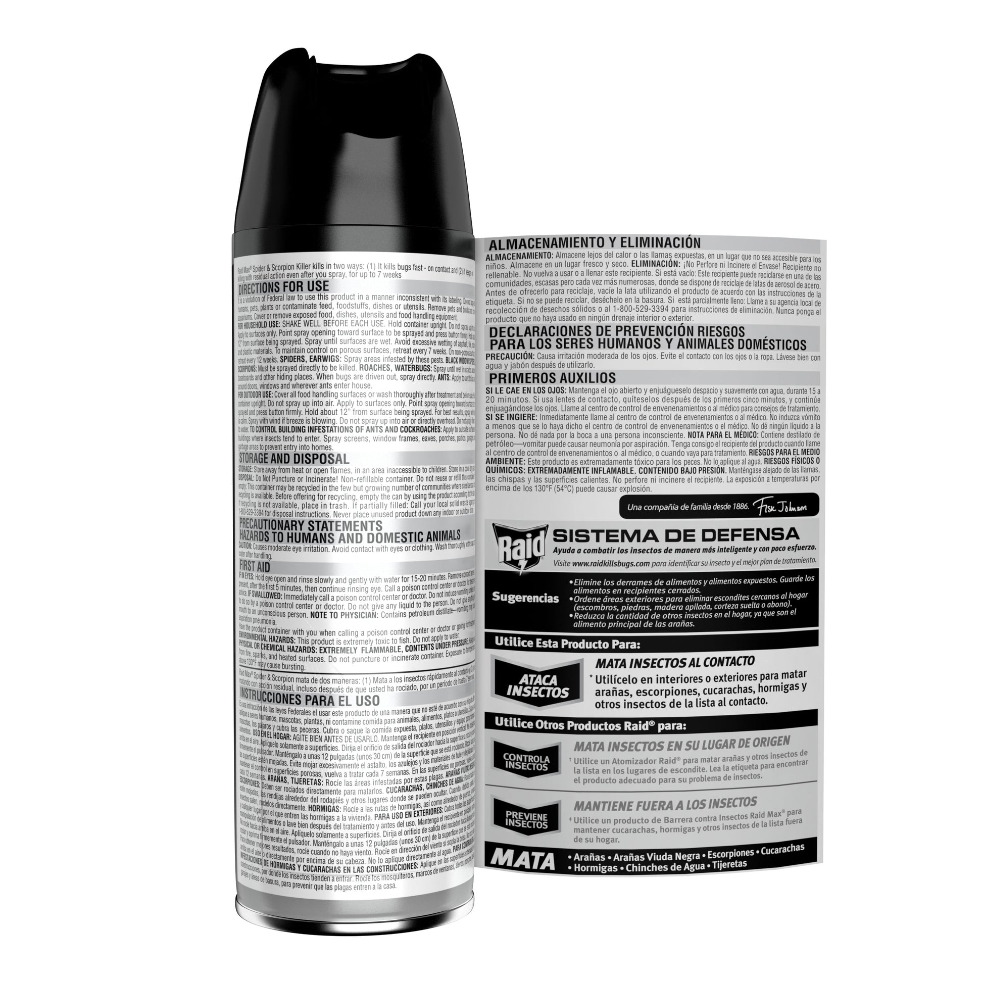 Raid® MAX Spider and Scorpion Killer works directly on these pests and kills on contact. It's a fast acting spider spray that helps protect you and your family, whether indoors or outdoors. It's also a roach killer, ant killer, earwig killer and waterbug killer that offers effective protection with no lingering chemical odor. Re-treat every 7 weeks on porous surfaces and every 12 weeks on non-porous surfaces. Spray spiders and scorpions directly.Raid® MAX Spider and Scorpion Killer is part of the Raid® Defense System which uses a combination of products to help fight bugs in your home.