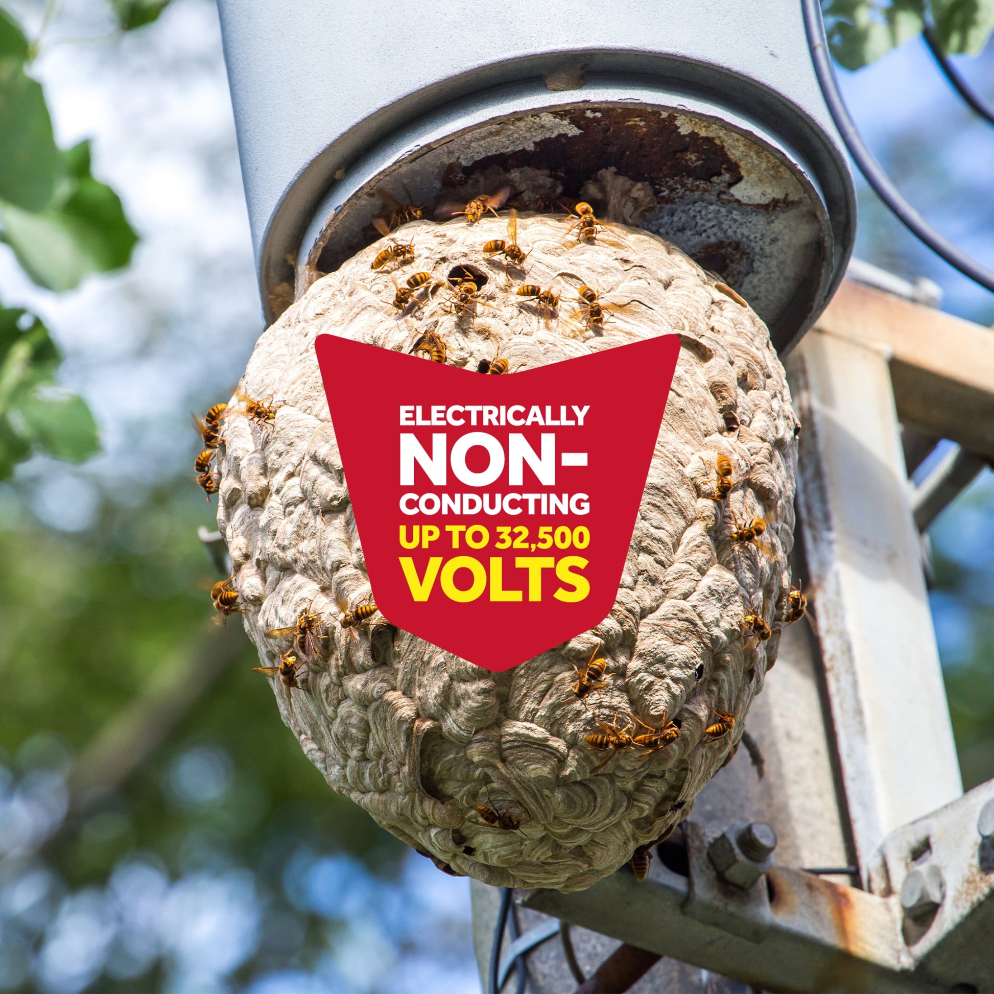 Electrically non-conducting wasp nest remover up to 32,500 volts