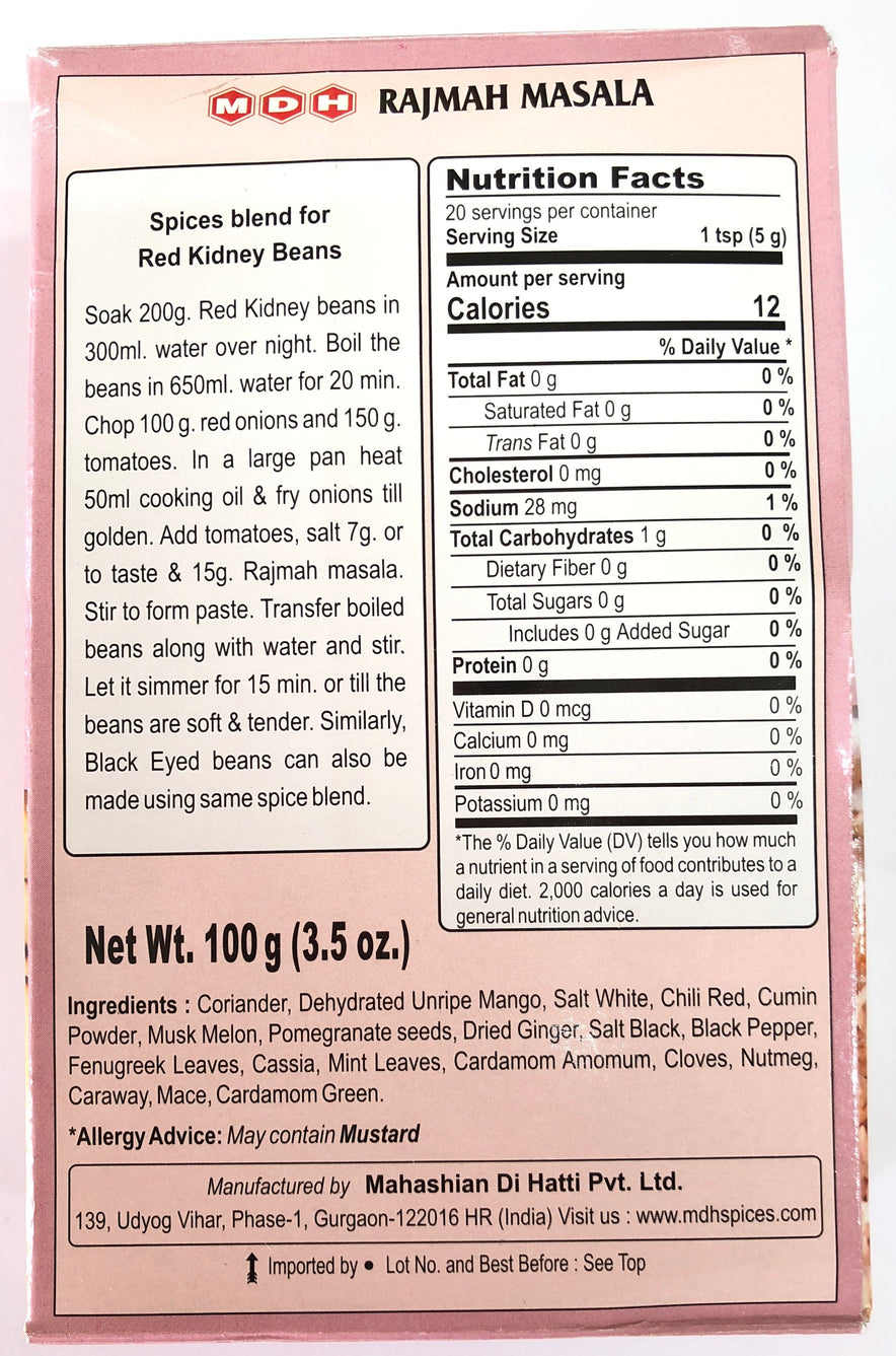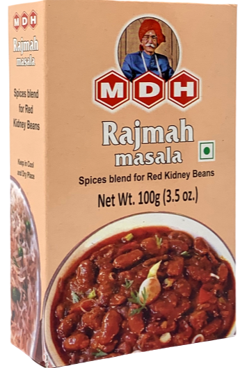 Recipe : Soak 200g. Red Kidney beans in 300ml. water over night. Boil the beans in 650ml. water for 20 min. Chop100g. red onions and 150g. tomatoes. In a large pan heat 50ml cooking oil and fry onions till golden. Add tomatoes, salt 7g. or to taste & 15g. Rajmah masala. Stir to form paste. Transfer boiled beans along with water and stir. Let it simmer for 15 min. or till the beans are soft & tender. Similarly, Black Eyed beans can also be made using same spice blend.