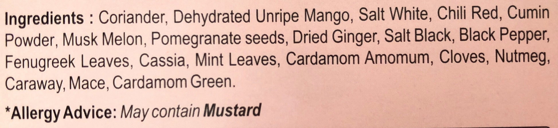 Ingredients : Coriander seeds, Dry Mango, Iodised Salt, Cumin, Red Chillies, Kachri, Black Salt, Pomegranate Seeds, Black, Pepper, Tamarind, Dried Ginger, Mint Leaves, Cassia, Fenugreek Leaves, Cardamom Amomum, Nutmeg, Cloves, Mace.