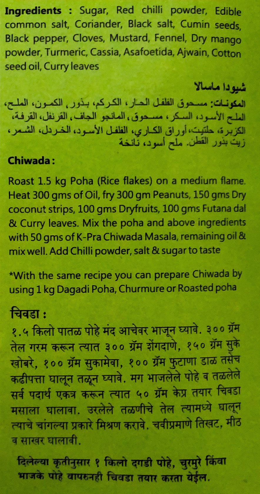 This Chivda is a savory snack mix. Mixture of lentils, peanuts and gently fried in cholesterol free corn oil after which, they are sprinkled with a combination of spices using a secret recipe handed down from generation to generation to create a unique snack.