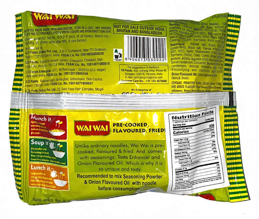 "Munch it, Soup it, Lunch it" Perhaps the most common brand of dry foods in Nepal, Wai-Wai is produced by Chaudhary’ group under CG Foods (Nepal) Pvt. Ltd. in Nepal and India. Wai-Wai can be eaten straight from the package or cooked in soup form or can be boiled and stir fried like chowmein. Unlike ordinary noodles, Wai-Wai is pre-cooked, flavored, seasoned and fried before packaging. It comes in various seasoning flavors. A pack of Wai-Wai includes chili powder, masala (mixed spices) and onion oil which can be used to prepare the soup or stir fry. Wai-Wai is rich in carbohydrates, minerals and proteins.